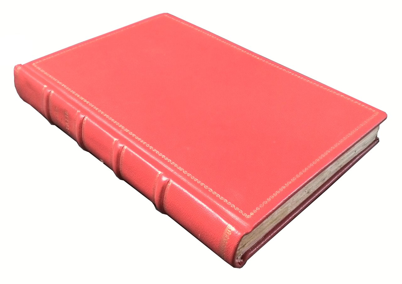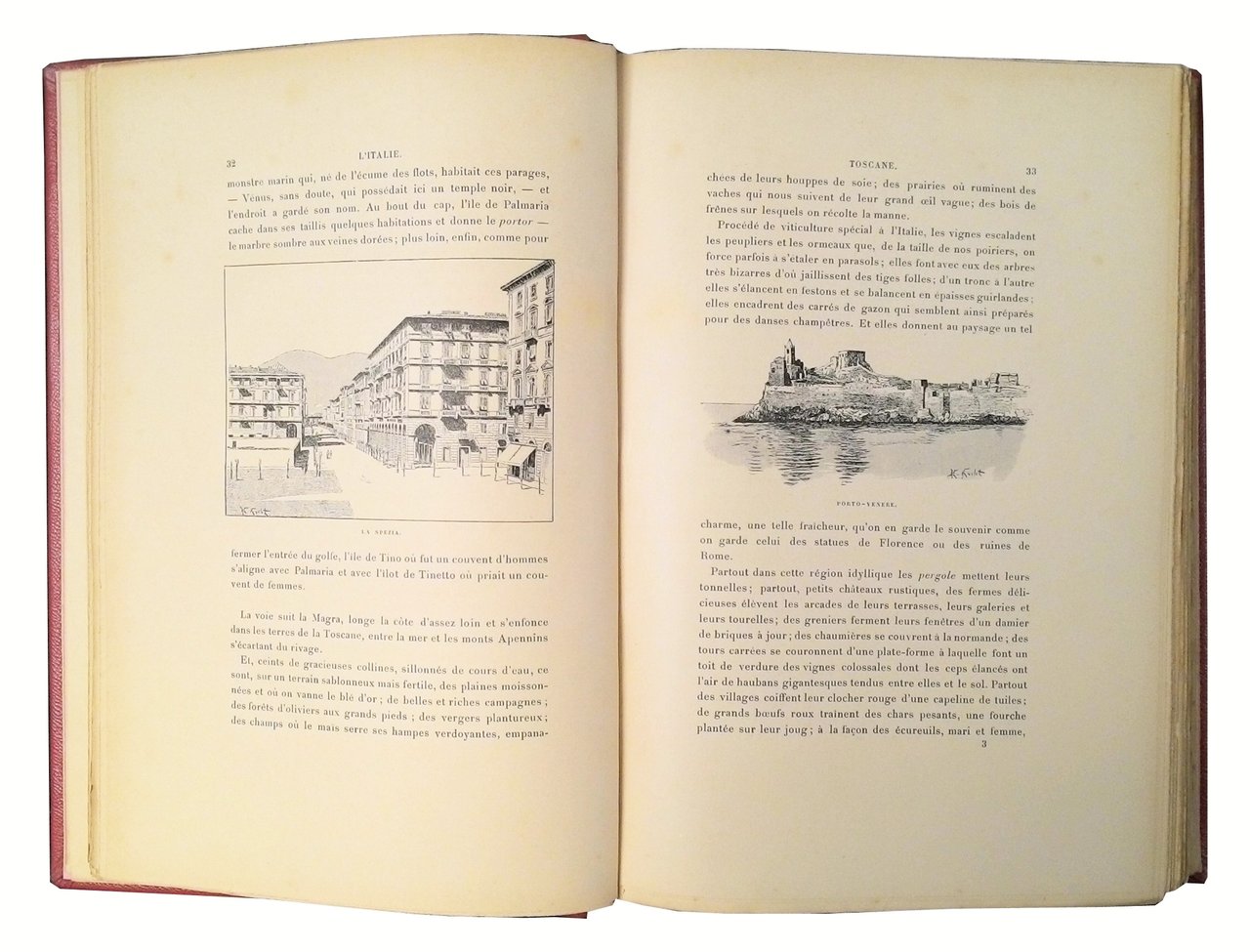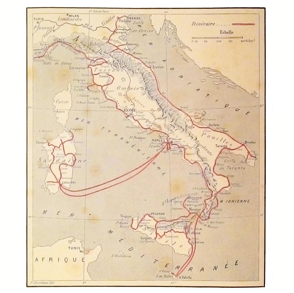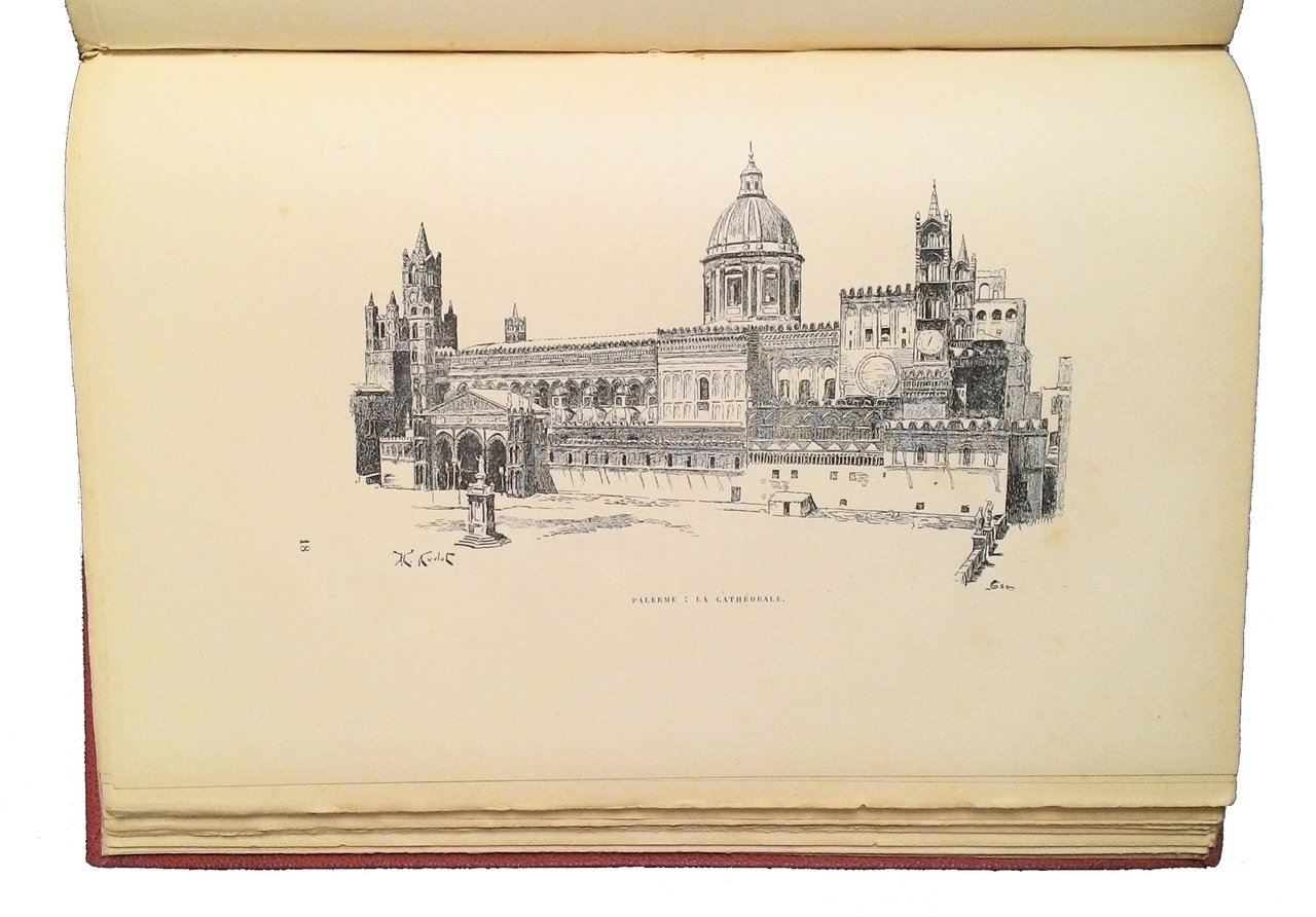8vo (285x195 mm); leg. moderna in similpelle rossa a quattro nervi, con fregi dorati ai piatti e al dorso, titolo dorato al dorso, guardie marmorizzate, belle brossure originali figurate a colori (con titoli in rosso e seppia); pp. 4+400; una carta itineraria a colori all'antiporta, nel testo 120 illustrazioni silografiche anche a piena pagina, con pittoresche vedute, personaggi tipici, etc. L’anno di pubblicazione non è indicato, ma dovrebbe essere circa il 1897. Opera facente parte della collana "Autour de la Mediterranee", comprendente tre serie, tra le quali quella de "Les cotes latines", cui la presente appartiene; classico grand-tour dell'Italia, che ci porta in ogni regione ed isola a conoscere l’Italia del tempo sotto tutti gli aspetti. Rif.: IT\ICCU\VEA\0118074. Cond.: Qualche rara fioritura; opera in condizioni generali molto buone. -- BEAUTIFUL DESCRIPTIVE WORK OF A JOURNEY ALONG THE ITALIAN COASTS, WHICH IS PART OF THE SERIES "AUTOUR DE LA MEDITERRANEE". Rare foxing; overall, copy in very good condition.