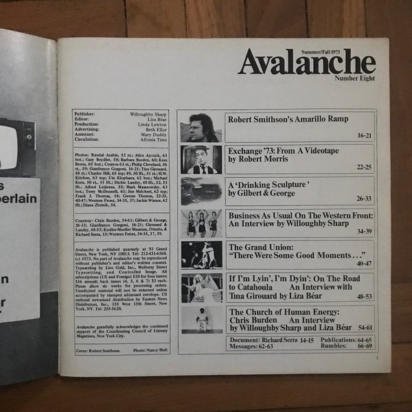 Essays include "Robert Smithson's Amarillo Ramp"; "Exchange '73: From a Videotape" by Robert Morris; "A Drinking Sculpture" by Gilbert & George; "Business as Usual On the Western Front: An interview by Willoughby Sharp"; "The Grand Union: 'There Were Some Good Moments'" and "If I'm Lyin', I'm Dyin': On The Road to Catahoula, An Interview with Tina Girouard by Liza Bear" and "The Church of Human Energy: Chris Burden, An Interview by Sharp and Bear. — Testi: Bear Liza. F.to: 24x24; pagg. 84; BN; rileg. Punto metallico. Editore: Liza Bear , New York, 1973.