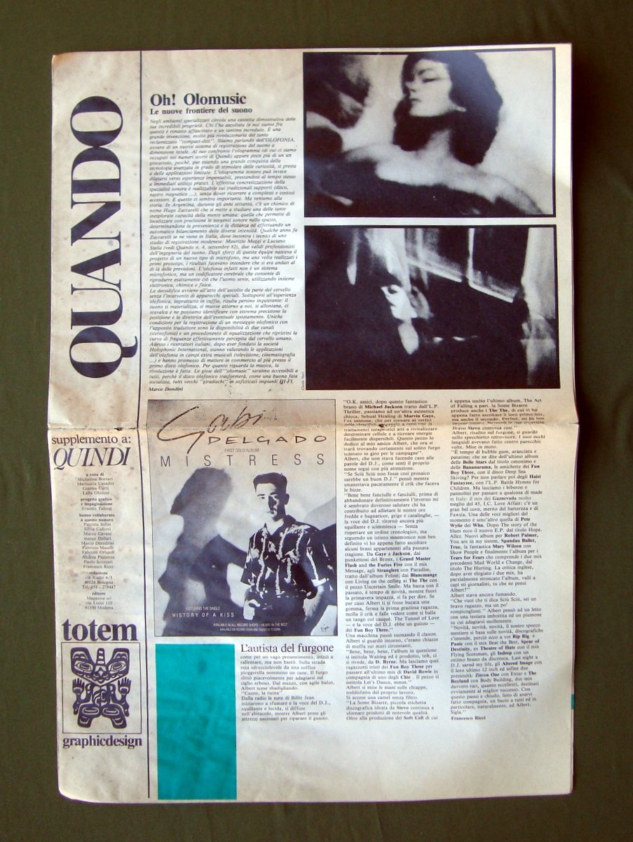 Giornale, Quando supplemento a Quindi Oh! Olomusic Le nuove frontiere del suono Magazine srl Editore, Modena, s.d. (anni '80); pp 8 con molte illustrazioni fotografiche bianco e nero, alcune su fondo verde; cm 48x32,5 Condizioni di conservazione Esemplare ben conservato con tracce d'uso del tempo, normale piega di conservazione che si presenta leggermente ingiallite e con piccoli strappetti; bruniture e piccole macchiette;per condizioni vedi foto. Raro inserto della Rivista modenese di avanguardia Quindi" SC03.D16648 blu "