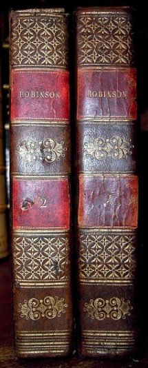 Opera in 2 volumi in 12 grande (18 x 10 cm.) legatura coeva in piena pelle, titoli al tassello al dorso finemente ornato in oro. Sguardie marmorizzate, bianche, tavole dantiporta incise in rame, frontespizi con vignetta incisa, 528, 506 pp, 14 tavole ft pi 2 vignette in rame, per un totale di 28 incisioni. Eccellente, rara edizione in francese delle avventure di Robinson Crusoe, capolavoro di Defoe. Intatta l'atmosfera magica ed irreale delle famosissime vicissitudini, arricchita dalle belle tavole in rame che raffigurano i momenti salienti del racconto. Val la pena di segnalare la bella conservazione dei volumi, le poche ed ininfluenti mende d'uso, una lieve brunitura della carta. Importante e in bello stato.