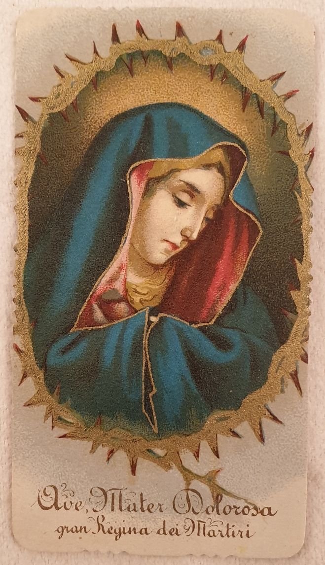 Immaginetta sacra di Ave Mater dolorosa Regina dei Martiri dei primi del novecento. Al verso orazione. In ottime condizioni. In 24. Dim. cm 10,5x5,5.Holy image of Ave Mater dolorosa of early 20th century. In the verso oration. In very good conditions. In 24. Dim. cm 10,5x5,5.