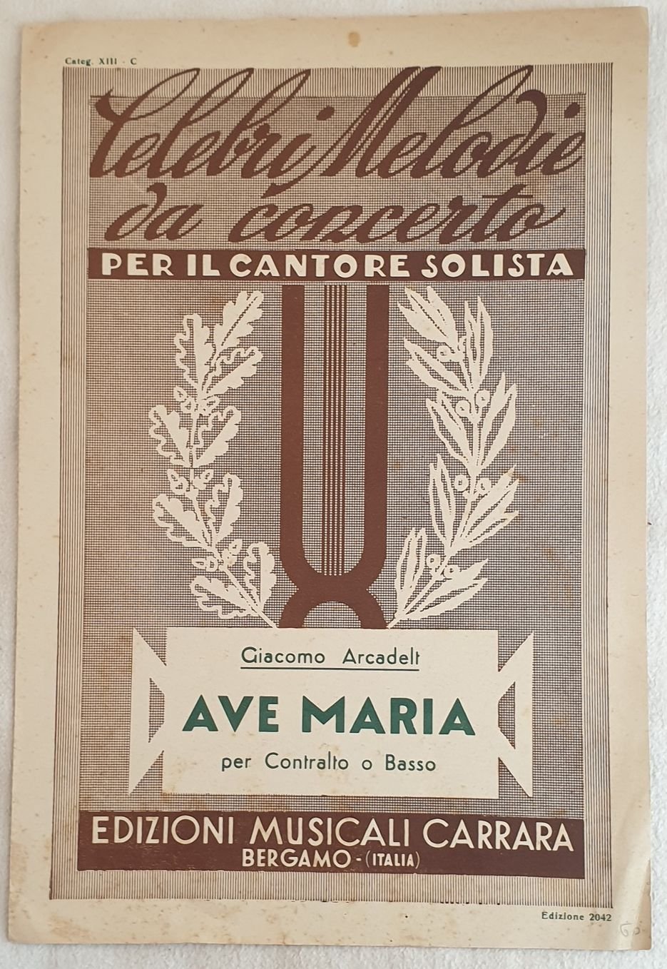 Spartito degli anni '30 del pezzo "Ave Maria" per contralto o basso del compositore Jakob Arcadelt (1507-1568) In buone condizioni. Formato cm. 31x21,5. Pp. (2)+(2). Musical score of 1930's of the piece "Ave Maria" for bass by the composer Jakob Arcadelt (1507-1568) In good condittions Size cm. 31x21,5. Pp. (2)+(2). <BR><BR>