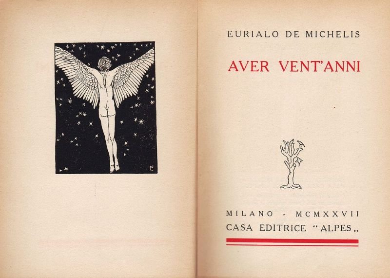 In-16°, legatura in brossura muta e sopracoperta editoriale con vignetta, pp. 200(8). Antiporta xilografico, titoli in rosso enero al frontespizio, fregi tipografici. Alla prima bianca e alla dedicatoria sono asportate le firme. Per il resto buon esemplare dell'Opera Prima di De Michelis.