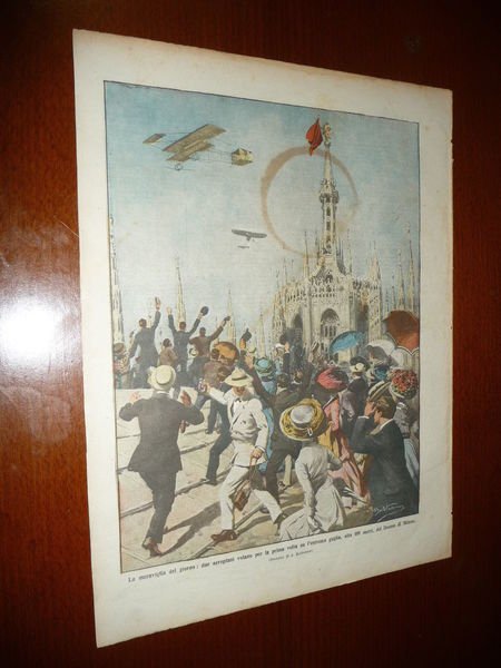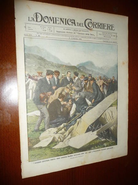 DESCRIZIONE: Domenica del Corriere, Milano, Anno 12 n. 40 (2 ottobre 1910). COPERTINA: L'aviatore peruviano Chavez, dopo aver compiuta l'audace traversata delle Alpi, cade a Domodossola ferendosi gravemente. RETRO: La meraviglia del giorno: due aeroplani volano per la prima volta su l'estrema guglia, alta 109 metri, del Duomo di Milano. La Domenica del Corriere è stato un popolare settimanale italiano fondato a Milano nel 1899 e chiuso nel 1989. Apparve per la prima volta nelle edicole l'8 gennaio 1899 come supplemento illustrato del Corriere della Sera. Stampata in grande formato (sul modello del domenicale La Tribuna illustrata), aveva 12 pagine e veniva distribuita gratis agli abbonati del Corriere, oppure si poteva acquistare in edicola per 10 centesimi. La prima e ultima di copertina erano sempre disegnate. Il Corriere si avvaleva di un giovane disegnatore, Achille Beltrame, allora sconosciuto, a cui veniva affidato in ogni numero il compito di rendere con la sua tavola il fatto più interessante della settimana. Dopo la sua morte nel 1945, fu sostituito da Walter Molino che, come il suo predecessore, firmò memorabili copertine. A differenza dei settimanali dell'epoca, la Domenica del Corriere diede ampio spazio alle fotografie e ai disegni, e questo fu uno dei motivi del suo successo. CONDIZIONI: Buone senza spillette, senza sovracc. azzurrina tracce di fox, proveniente da rilegatura, con macchia al retro come da foto. PESO / WEIGHT: 43 gr. without package.