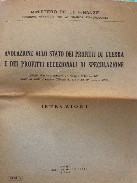 <p>CODICE 100 SCATOLA 3 ARALDICA</p>, , <p>AVOCAZIONE ALLO STATO DEI PROFITTI DI GUERRA E DEI PROFITTI ECCEZIONALI DI SPECULAZIONE ISTRUZIONI ROMA LA LIBRERIA DELLO STATO 1946 PAG 24</p>,