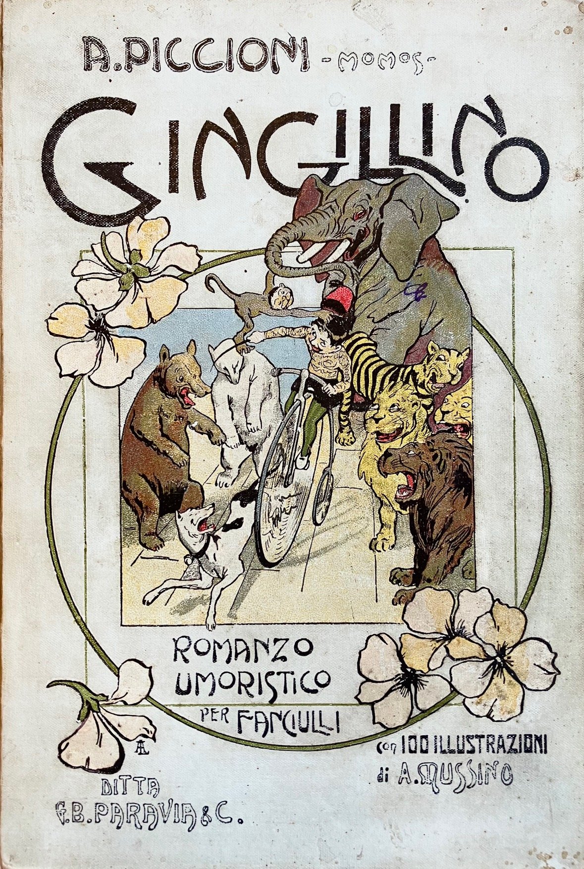 Legatura editoriale in piena tela, titoli al piatto e al dorso, risguardi in carta decorata, numerose illustrazioni a colori nel testo di Attilio Mussino, una tavola in b/n fuori testo col ritratto fotografico dell'autore. Segni d'uso e piccole macchie alla legatura, lievi e rade fioriture alle carte (più evidenti a una carta con pieghe ai margini), in stato più che buono.