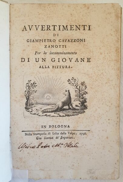Prima edizione del 1756 di questo manuale di introduzione alla pittura scritto da Giampietro Cavazzoni Zanotti (1674-1765) pittore e poeta bolognese dell'Accademia Clementina. Bella incisione calcografica al frontespizio e antica firma manoscritta. All'interno: Delle qualità necessarie ad un giovane voglioso di apprendere la pittura, Elenzione del Maestro, Come lo scolare s'abbia a contenere col Maestro, Utilità del copiare le opere dei Gran Maestri, Colorito, Quanto sia necessario valersi del neero, Teorica e pratica, Simmetria, Notomia, Prospettiva, Invenzione, Disposizione, Affetti, Costume, Grazia. In buone condizioni. Copertina in piena pergamena ottocentesca con titolo su tassello in pelle al dorso in buone condizioni generali con lievi usure ai margini e dorso. Legatura in buone condizioni. Pagine in buone condizioni con fioriture. In 8. Dim. 20x13 cm. Pp. (8)+135+(1)+(4). Peso Kg. 0,250. First edition of 1756 of this manual of introduction to painting written by Giampietro Cavazzoni Zanotti (1674-1765) painting and poet from Bologna belonging to Accademia Clementina. Beautiful calcographic engraving in the title page and handwritten note. In good conditions. Full parchment cover of XIX century with spine title leather label in the spine in good general conditions lightly worn in the extremities. Binding in good conditions. Inside pages are in good conditions with foxing.In 8. Dim. 20x13 cm. Pp. (8)+135+(1)+(4). Weight Kg. 0,250