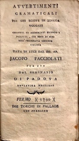 Avvertimenti gramaticali per chi scrive in lingua volgare corretti ed accresciuti secondo i precetti, che sono in fine dell’ortografia moderna italiana.