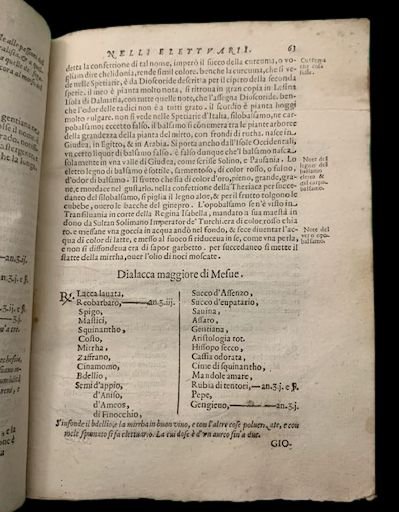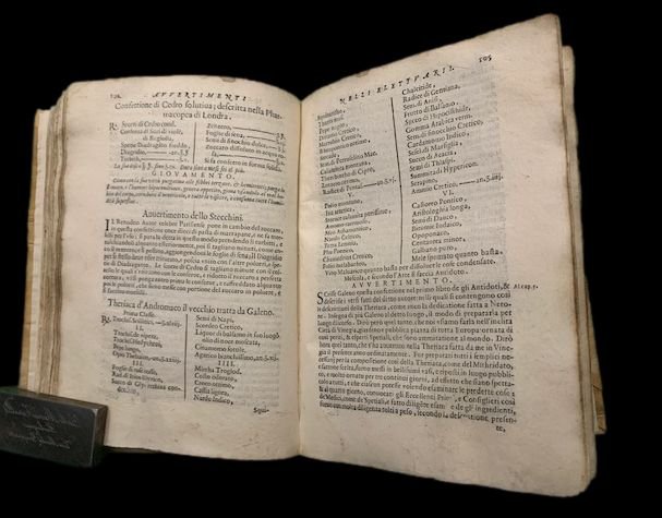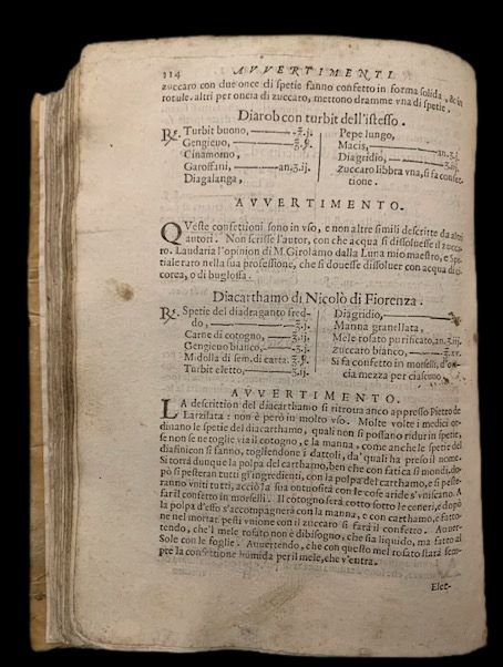 In 4°; (28), 522, (2) pp. Legatura coeva in pergamena semi-rigida che presenta restauri ed integrazioni di pelle. Sguardie sostituite con carte antiche. Lievi restauri con sottile integrazione di con carta di riso al margine basso bianco delle prime 3 carte e delle ultime tre carte . Lievissimo consolidamento agli angoli superiori bianchi delle prime dieci carte e di 8 altre carte (questi restauri sono sempre minimi). Alcuni angoli esterni arrotondati e alcune carte tagliate in modo diseguale, ininfluente. Gli abili restauri, riguardano, sempre i margini esterni bianchi. I volumi di spezieria e farmacia, proprio per il tipo di utilizzo che ne veniva fatto, sono spesso soggetti a segni d'usura. Nel complesso, all'interno, l'esemplare si presenta in più che discrete condizioni di conservazione. Terza rara edizione, più rara sia della prima che della seconda, di questo importante trattato di farmacia che contiene, alla fine, il trattato della Theriaca. Gli autori dell'opera, in quest'edizione, notevolmente aumentata da Stecchini, rispetto alle due edizioni precedenti (questa è la prima edizione curata e con le aggiunte di Stecchini), tanto che molte pagine sono qui presenti in prima edizione, furono tutti speziali della celeberrima Farmacia dello Struzzo di Venezia, la più celebre farmacia veneziana dell'epoca. Nell'opera sono raccolti centinaia di ricette farmaceutiche per la preparazione di medicine e preparati erboristici. Scrive la dottoressa Sabrina Minuzzi nella sua tesi di laurea dal titolo Sul filo dei segreti medicinali: praticanti e professionisti del mercato della cura a Venezia, Università degli Studi di Verona: "Oltretutto, con gli anni, Paolo Romani accresceva fama e notorietà per sé e per la spezieria nella quale operava, probabilmete anche grazie alla brevettazione dei suoi sciroppi solidificati, tanto che allaltezza del 1627 Alberto Stecchini, lo speziale autore degli Avvertimenti nelle composizioni de medicamenti per uso della speciaria, potrà dire della farmacia allo Struzzo: E si come gli anni passati fu famosa & honorata per la rara virtù & valor de gli huomini che la regevano, & particolarmente per lintelligenza grande che M. Georgio Melichio B.M. havea delle cose appartenenti alla spetiaria, così al tempo dhoggi è nel maggior colmo che sia mai stata per lingegno & bontà singolare del signor Paolo Romani, che al presente ne è pattrone, allievo e successore del sudetto M. Giorgio. Così nel 1595 tra gli speziali veneziani e Paolo Romani si era ingaggiata una lite destinata a durare oltre due anni: al priore e ai consiglieri vengono affiancati sei aggiunti per consultar, comparar, sollicitar, et deffender la predetta lite contro il predetto messer Paulo dal Struzzo. Un tentativo del 1596 di comporre la questione in modo che ognuno di essi spitieri medicinali possi far quello li parerà nelle sue botteghe in materia della loro professione de spetiari medicinali viene respinto sul nascere dai membri dellarte, con un solo voto favorevole e 39 contrari".. Prosegue poi la studiosa gli Avvertimenti nelle compositioni medicinali di Giorgio Melliquio augustano, ci prepariamo ad entrare a pieno titolo in una delle spezierie medicinali più attive di Venezia: quella allo Struzzo sul ponte dei Baretteri, a pochi passi da piazza San Marco, gestita da Georg Melich augustano, naturalizzato Giorgio Melichio. In un certo senso è la bottega medicinale che dà continuità alla tradizione iatrochimica dei suoi titolari, inaugurata appunto dal tedesco Melichio huomo dottissimo & nella sua professione è unico [ ], grandissimo distillatore. Stabilitosi a Venezia dopo aver approfondito le sue conoscenze farmaceutiche viaggiando fra la Grecia e lItalia, nel 1565 Melichio è tra i maestri fondatori del collegio degli speziali, ben inserito nellambiente lagunare, in relazione con medici, speziali e distillatori. I suoi Avvertimenti nelle compositioni de medicamenti per uso della spetiaria escono per la prima volta a Venezia nel 1575, e da allora saranno ininterrottamente riproposti in una dozzina di edizioni veneziane fino al 1720, e per un pubblico europeo nella traduzione latina del medico Samuel Keller, compiuta nel 1586, in diverse edizioni di Francoforte.44 La peculiarità degli Avvertimenti è la presenza di numerose ricette di distillati dal regno vegetale, animale e anche minerale e soprattutto di un nucleo di rimedi chimici che di edizione in edizione va accrescendosi e contemperando armoniosamente le ricette di impianto più tradizionale. Il tutto esposto con piglio didascalico, senza oscurità di sorta. Potremmo prendere lopera quasi a metafora della realtà veneziana: la nuova tradizione chimico-spagirica si innesta silenziosamente nella più antica galenica imperante e la trasforma dallinterno, senza grandi sussulti esteriori. Scomparso Melichio nel 1585, dal 1627 gli Avvertimenti saranno accresciuti, anche della loro componente chimica, da Alberto Stecchini, lo speziale che subentrò nella gestione dello Struzzo dopo Paolo Romani, che in pochi anni laveva ampliata magnificamente con nove inventioni di secreti. Spezieria allo Struzzo: Antonio de Sgobbis. Alla morte di Stecchini, nel 1631, la spezieria allo Struzzo passò ad Antonio de Sgobbis, speziale originario di Montagnana .". In fondo al volume l'importante scritto dedicato al miracoloso preparato farmaceutico della teriaca. Questa è un prepatrato farmaceutico antichissimo. Il nome deriva dal greco ?a? theriak?, cioè antidoto, oppure dal sanscrito táraca, dove tár significa salva, è quello che oggi verrebbe definito un polifarmaco ed è forse il primo ed il più antico oggi conosciuto e venne prodotto fino allinizio del novecento. La Terica si credeva che fosse un medicinale miracoloso capace di curare un innumerevole numero di malattie derivanti dai veleni prodotti dal corpo umano. La versione italiana del farmaco deriva probabilmente da epoca romano quando vennero a conoscenza dellantidoto universale di Mi