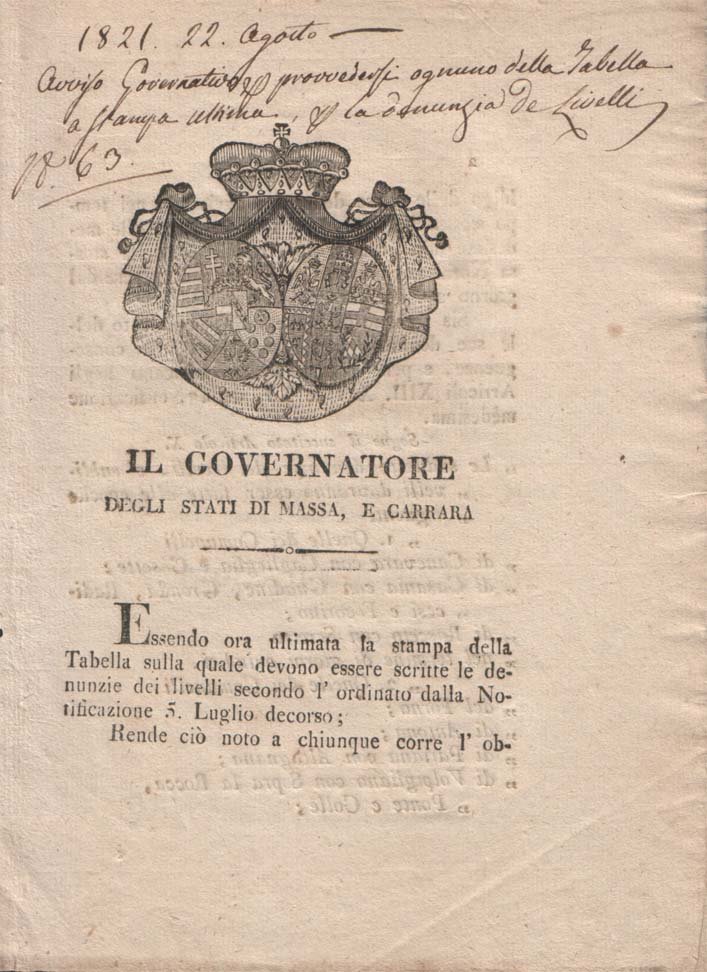 Avviso governativo che rende nota la disponibilità, essendone ultimata la stampa, delle tabelle per la denuncia di livelli e sublivelli relativi a beni posti nel Ducato di Massa