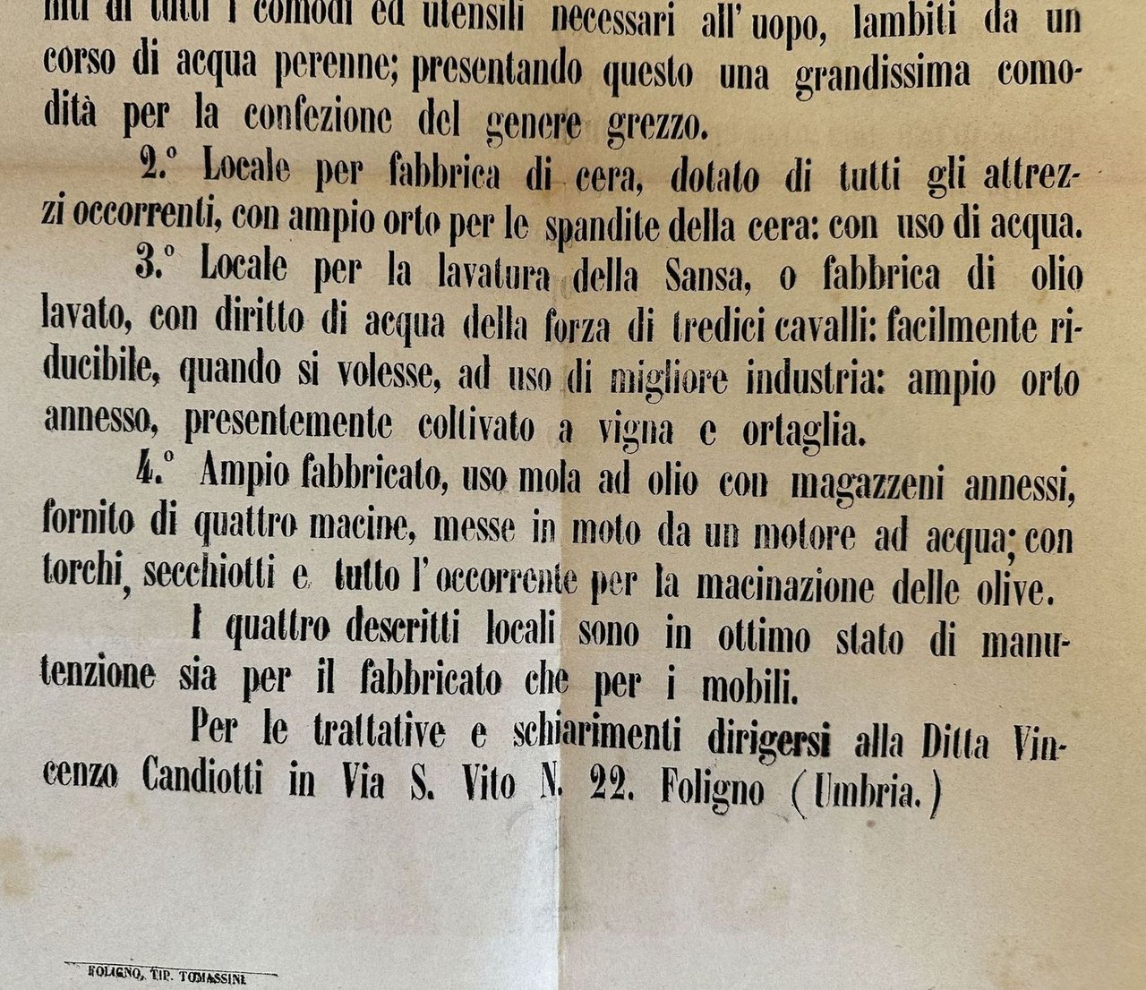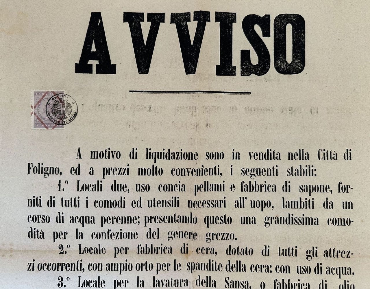 Rarissima locandina del 1870 circa, un avviso di vendita di alcuni locali della Ditta Vincenzo Candiotti in via San Vito n. 22 a Foligno. Si tratta di quattro locali: uno per la conciatura della pelle e fabbrica di sapone; Locale per fabbrica di cera; Locale per la lavatura della sansa; un locale per la molatura dell'olio. Marca da bollo per il periodo 1863-71. In ottime condizioni. Piegature. Di grandi dimensioni. 49x33 cm