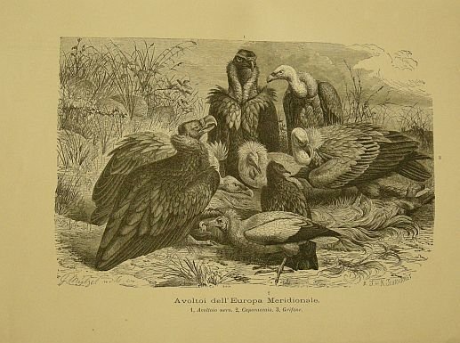 Avvoltoi dell'Europa Meridionale. Tratto da "La vita degli animali" di A.E. Brehm. Seconda edizione sulla terza tedesca a cura del Prof. M. Lessona.
