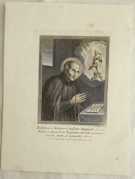 Incisione su acciaio originale del 1825 circa, il ritratto del Beato Alfonso Rodriguez (1533-1617) incisa da Giovanni Petrini. Venne canonizzato nel 1888. Dimensioni foglio: mm 225x170.Dimensione incisione al margine: mm 150x110 In buone condizioni. Nice original steel engraving of 1825 circa the portrait of the Blessed Alfonso Rodriguez (1533-1617) engraved by Giovanni Petrini. He was declaired Saint in 1888. Size of the page: mm 225x170. Size of the print: mm 150x110 In good conditions.