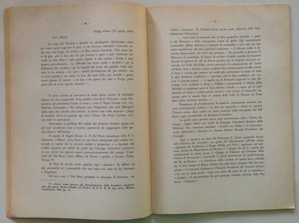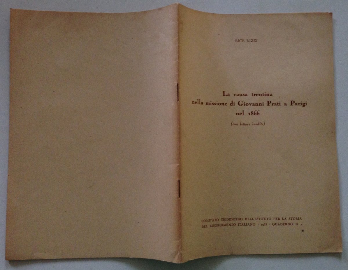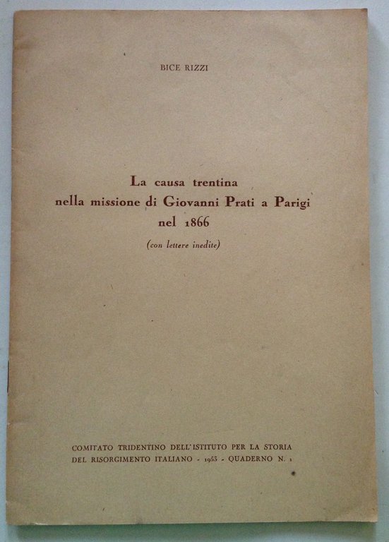 B. Rizzi , La causa trentina nella missione di Giovanni Prati a Parigi nel 1866 (con lettere inedite) Comitato Tridentino dell'Istituto per la Storia del Risorgimento Italiano, 1953; cm. 24x17; pp. 27; con lettere inedite; br. ed. Condizioni di conservazione Esemplare in buono stato con leggere tracce d'uso e con bruniture. OPEB.4683 MT