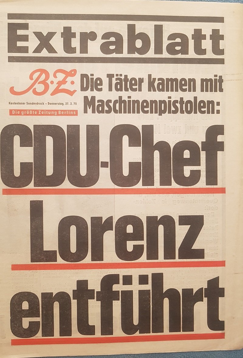 Sonderausgabe mit vier Seiten zur Entführung des CDU-Politikers und damaligen Spitzenkandidaten im Jahr 1975. Die Ausgabe liegt im klassischen Zeitungsformat vor, neben Texten sind auch fotografische Abbildungen enthalten. Die Abbildungen zeigen Lorenz unter anderem mit seiner Ehefrau in ganzseitigen Formaten. Heute seltene Original-Publikation aus dem (fernen) Westberlin der 1970er Jahre!