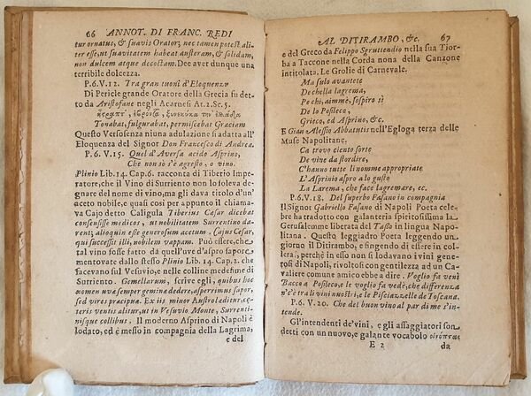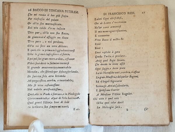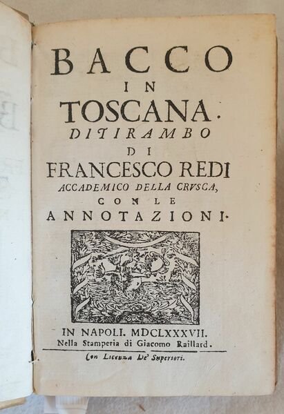 Secpnda edizione del 1687, variante A, del celebre poema Bacco in Toscana di Francesco Redi (Arezzo 1626 - Pisa 1697) medico, naturalista, e letterato. Il famoso poema sul vino nelle annotazioni a piè di pagina ne descrive le virtù e gli effetti in caso di eccesso. Notiamo come il poeta trovi modo di ricordare, insieme ai vini toscani, una quantità di altri vini del suo tempo, italiani e stranieri. G. Dalmasso, Le vicende . della viticoltura e dell’enologia in Italia, 1937, p. 348. Axs Marca editoriale al frontespiizo: Sirena bicaudata e coronata tiene uno stemma in cornice vegetale. Antiche note manoscritte. In buone condizioni. Copertina in piena pergamena coeva in buone condizioni generali con lievi usure ai margini e dorso. Legatura in buone condizioni. All'interno le pagine si presentano in buone condizioni con rare fioriture. In 16. 17x11 cm. Pp. (12)+304 Beautiful edition of 1687, variant A of the famous poem of Francesco Redi (Arezzo 1626 - Pisa 1697) physician, naturalist and letterate. The first writing Bacco in Toscana is a famous poem about wine that in annotations describes its virtues and effects in case of excess. Antique handwritten notes. In good conditions. Full parchment coeval cover in good conditions lightly worn in the extremities. Binding in good conditions. Pages in good conditions with occasional foxing. In 16. 17x11 cm. Pp. (12)+304<BR><BR>