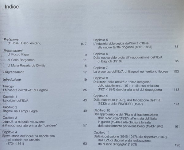 L'ILVA-Italsider non c'è più. La sua centralità nella vita di Napoli persiste non soltanto nelle sopravvivenze di archeologia industriale, ma nella memoria indelebile della città e nelle aspettative del suo popolo di una ripresa produttiva e civile che ha in Bagnoli il cardine fondamentale. Ne sono autorevole testimonianza la prefazione del Sindaco Rosa Iervolino Russo e gli interventi dei massimi responsabili - al momento in cui l'autore ha "chiuso" la redazione dell'opera - della Sovrintendenza ai Beni Archivistici della Campania e di Bagnolifutura a cui è affidato il compito di guidare il destino di Bagnoli e di inverare le speranze dei lavoratori napoletani.
