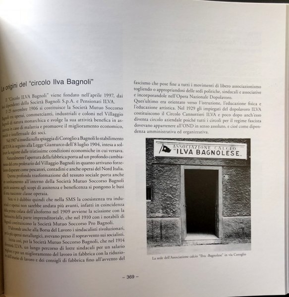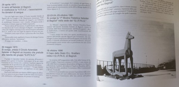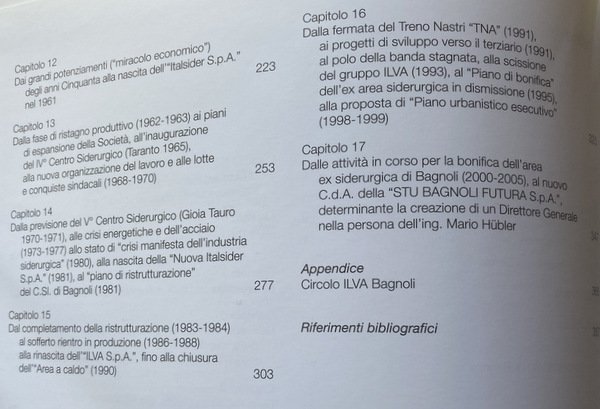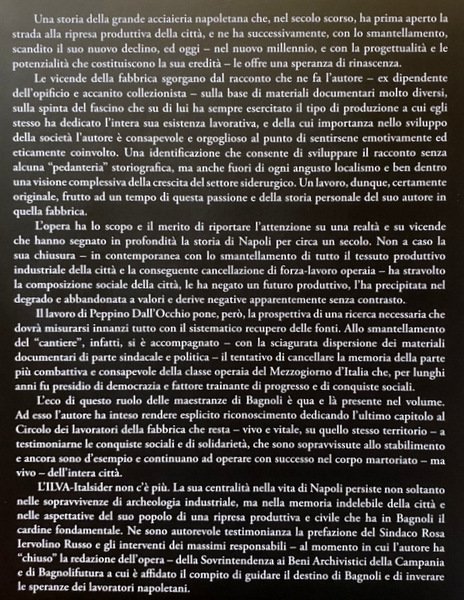 L'eco di questo ruolo delle maestranze di Bagnoli è qua e là presente nel volume. Ad esso l'autore ha inteso rendere esplicito riconoscimento dedicando l'ultimo capitolo al Circolo dei lavoratori della fabbrica che resta - vivo e vitale, su quello stesso territorio - a testimoniarne le conquiste sociali e di solidarietà, che sono sopravvissute allo stabilimento e ancora sono d'esempio e continuano ad operare con successo nel corpo martoriato - ma vivo - dell'intera città.