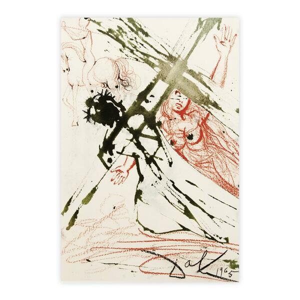 Dicit eis Pilatus: Regem vestrum crucifigam? Responderunt Pontifices: Non habemus regem, nisi Cæsarem (Ioannes, 19) "Et baiulans sibi crucem exivit in eum, qui dicitur Calvariæ, locum, hebraice autem Golgotha" (Ioannes, 19) Salvador Dalì (1904-1989)Serilitografia originale a colori firmata in lastraProvenienza: Biblia Sacra Vulgatæ Editionis Rizzoli editoris mediolani Anno Domini M.CM.LXVII (1967)Dimensioni: cm 48,5 x 35Riferimento: Volume V Pagina 256Certificato di autenticità allegato C.OA.Edizione disponibile: N. 1095/1499
