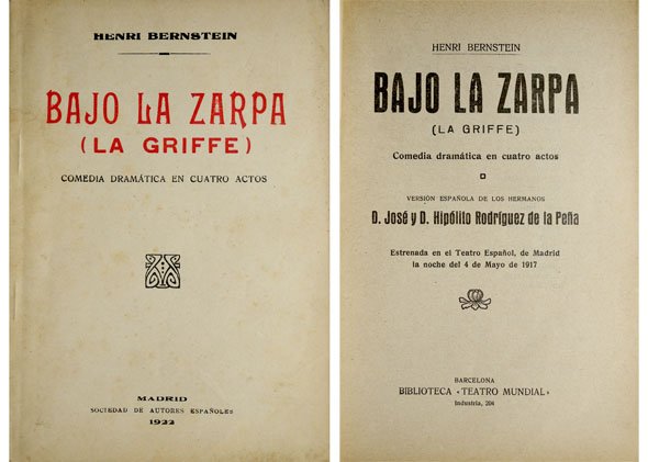 Bajo la zarpa. [La griffe]. Comedia dramática en cuatro actos. Versión española de los hermanos José e Hipólito Rodríguez de la Peña.