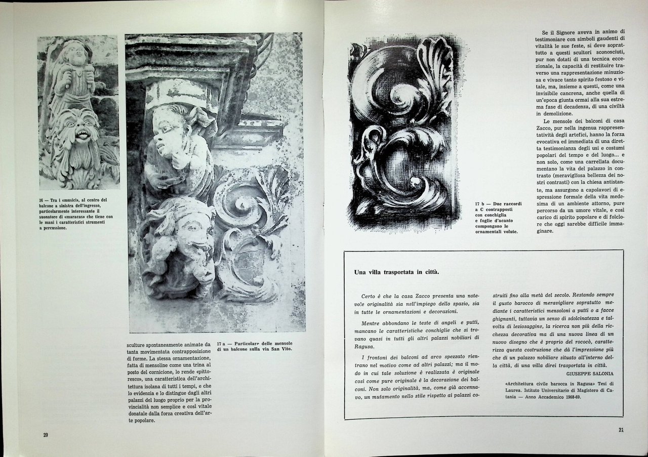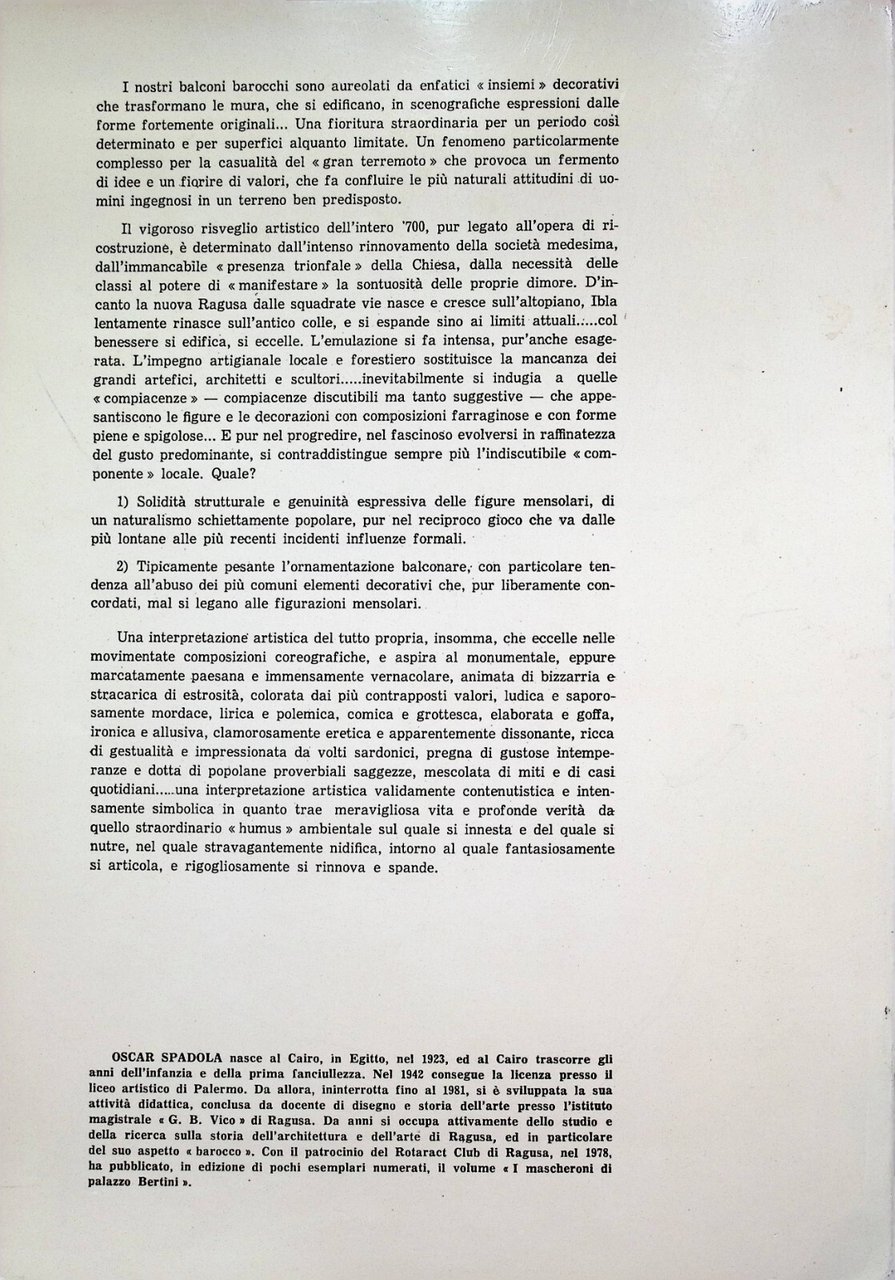 Editore: Rotary Club Ragusa Formato: in 4^, brossura Data di Pubblicazione: 1982 Rarissimo I nostri balconi barocchi sono aureolati da enfatici insiemi decorativi che trasformano le mura, che si edificano, in scenografiche espressioni dalle forme fortemente originali... Libro illustrato sui balconi, i mascheroni, i fregi, l'architettura dei grandi palazzi storici ragusani.