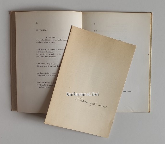 Stato di conservazione: MOLTO BUONO, copertina e tagli ingialliti con fioriture, qualche fioritura all'interno, per il resto in ordine. Collana: Poeti. Con allegata la "Lettera agli amici" (stampata su foglio ripiegato).