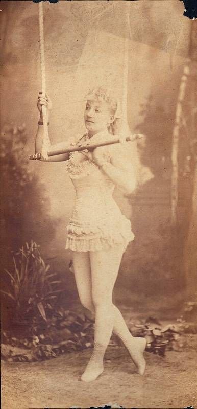 Fotografia all'albumina seppiata di cm.35x17 applicata su cartone di studio fotografico, raffigurazione di ballerina in costume appoggiata all'altalena. Nome e marchio del fotografo davanti e sul retro. Piccole mancanze ai bordi della fotografia.