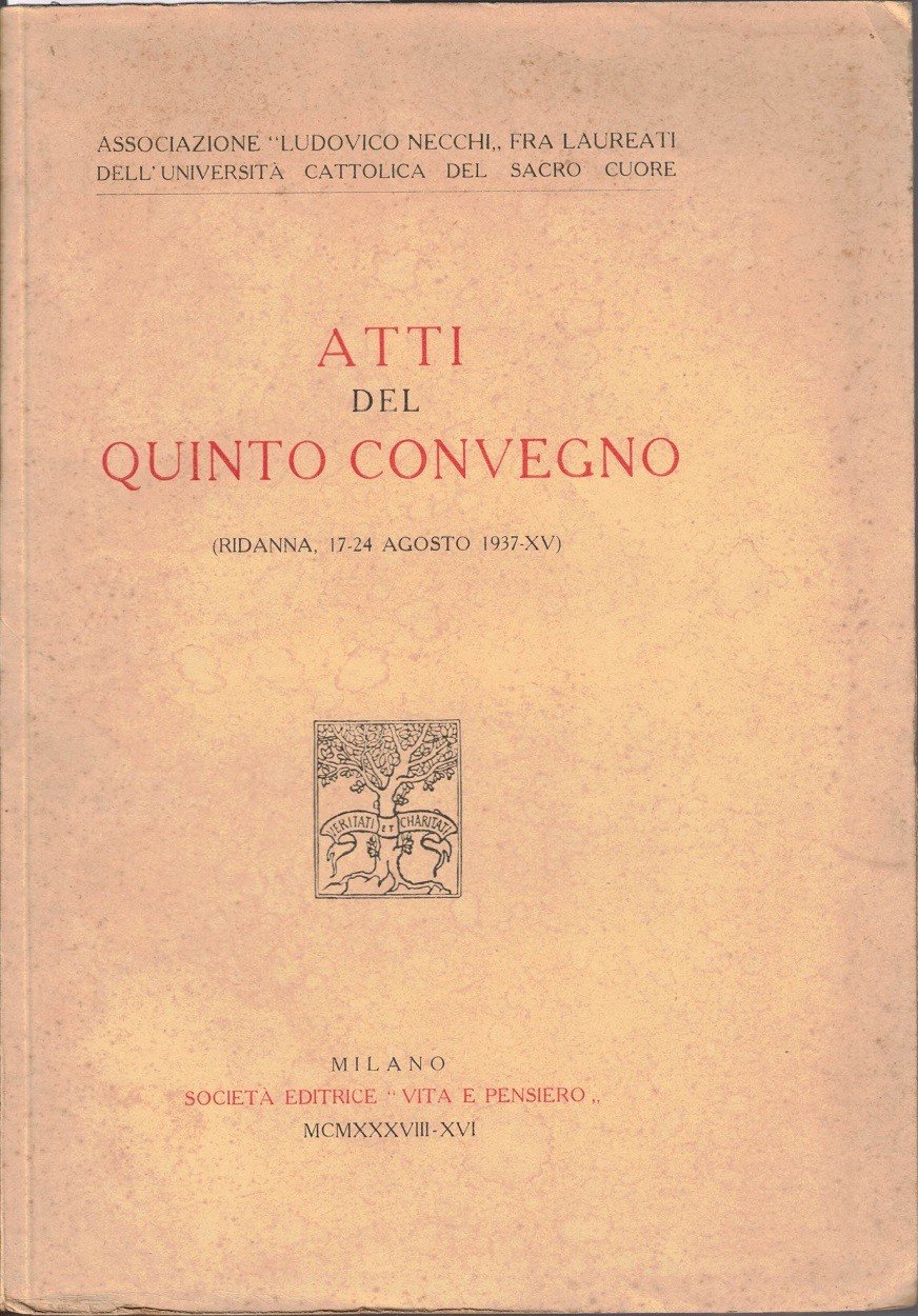 Ambrogio Ballini et al., Atti del quinto Convegno, Ridanna, 17-24 agosto 1937, Società Editrice Vita e Pensiero, Milano 1938, pp. X, 154, ill. b.n., 8 c. di tavv. f.t. ill. b.n., cm 25, br. ed. In testa al frontespizio: Associazione Ludovico Necchi fra laureati dell’Università Cattolica del Sacro Cuore. Indice: La Benedizione del Santo Padre – Introduzione – Nomine dei soci ad honorem – Partecipazione ad adesioni – Cronaca del Convegno – Mons. Michele Pellegrino, Ritiro – Ambrogio Ballini, Buddhismo e Cristianesimo – Gastone Chiozza, Questioni giurisprudenziali dibattute nel diritto concordatario matrimoniale – Antonio Dal Sasso, Il problema della personalità nel pensiero e nella vita contemporanea – Ezio Franceschini, Il letterato cattolico nella vita moderna – Giuseppe Mira, La politica nazional-socialista del lavoro – Giuseppe Nangeroni, L’ambiente fisico di Ridanna – Marina Vassalli, La collaborazione della scuola nella formazione della personalità. Lievissime tracce d’uso alla brossura, ordinari segni del tempo, per il resto perfetto. Intonso.