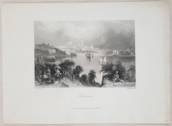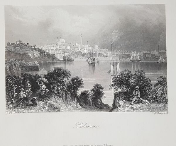 Bella veduta animata di Baltimore nel Maryland del 1860 circa. Autore: A. H. Payne su soggetto di W. H. Bartlett Data: 1860 circa Tecnica: Incisione su acciaio Dimensione della pagina: 18x25 cm Dimensione dell'incisione: 10,5x15 cm Condizioni. Buone. Alcune rare fioriture.Beautiful animated view of Baltimore in Maryland of 1860 circa. Author: A. H. Payne after W. H. Bartlett Date: 1860 circa Technique: Steel etching Leaf Dimension: 18x25 cm (7.1x9.8 inches) Engraving Dimension: 10,5x15 cm (4.1x5.9 inches) Conditions: Good conditions. Some occasional foxings