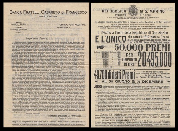 Banca Fratelli Casareto di Francesco. Genova, Aprile Maggio 1910. Programma ufficiale per la vendita delle ultime obbligazione e diecine di Obbligazione del Prestito a Premi della Repubblica di San Marino.