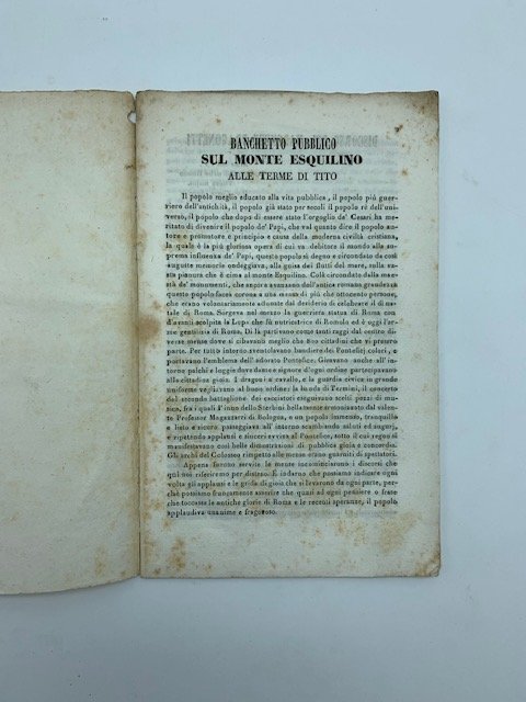 In 8, cm 12 x 19,5, pp. 24. Brossura editoriale muta. Rara plachetta dedicata al grandioso banchetto tenutosi in occasione del Natale di Roma del 1847 al quale accorsero ben 800 commensali con concorso di Dragoni e Guardia Civica, banda di Termini ecc. Dei molti discorsi qui vengono riportati quelli di Massimo D'Azeglio, del marchese Dragonetti, del professor Orioli, di Pietro Sterbini, la canzone di Alessandro Poerio, Roma, un'ode di P. Guerrini e delle sestine in dialetto trasteverino in cui si fa cenno a 'Cicioruacchio'. Interessante testimonianza che compare in molte relazioni e memorie (ad esempio Filippo De Boni) dell'entusiasmo popolare nei confronti di Pio IX e della sua svolta costituzionale