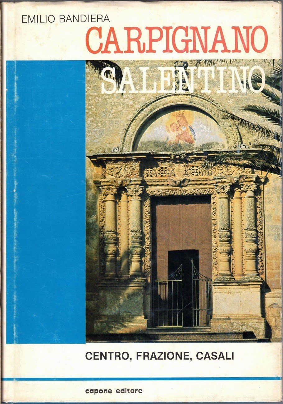 Emilio Bandiera, Carpignano Salentino. Centro, frazione, casali, Lorenzo Capone Editore s.r.l., pp. 213, ill. b.n., 1 c. di tav. f.t. ripiegata ill. b.n., cm 24, cart. ed. con titoli al dorso e al piatto e sovraccoperta. Collana Storie municipali, vol. 3. Indice: Premessa – Presentazione – Parliamo delle origini – Il periodo bizantino (Cripta Madonna delle Grazie – Madonna della Grotta – S. Cosimo o Carbieno) – Il lungo periodo del Feudalesimo – L’Ottocento e il Novecento Stigliano – Serrano – Elenco dei Sindaci – Elenco dei parroci di Carpignano – elenco die parroci di Serrano – Documenti riguardanti Carpignano e Serrano, presso l’Archivio Diocesano di Otranto – Bibliografia. Leggeri segni del tempo, minima ombra di gora al dorso e all’aletta posteriore della sovraccoperta e all’angolino superiore esterno delle ultime quattro carte, per il resto esemplare ben conservato.