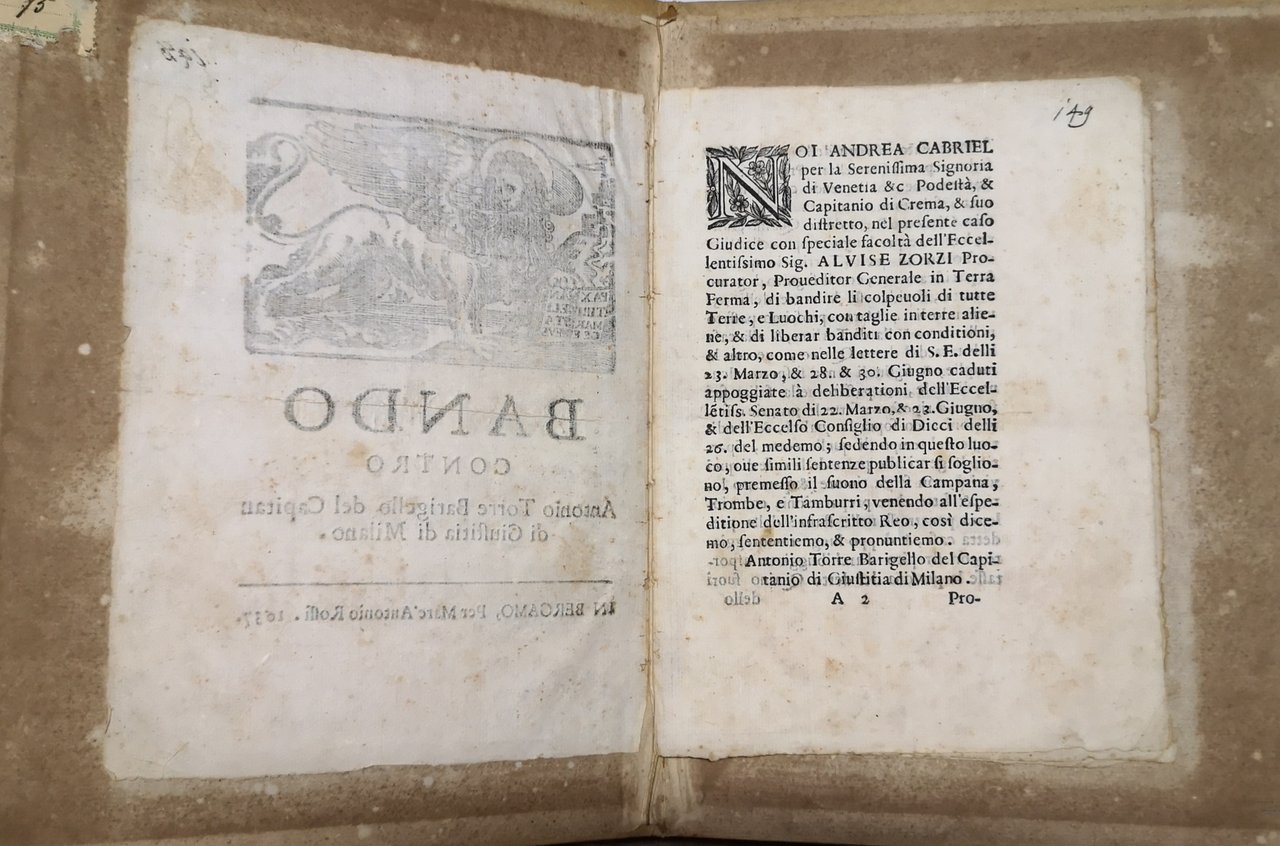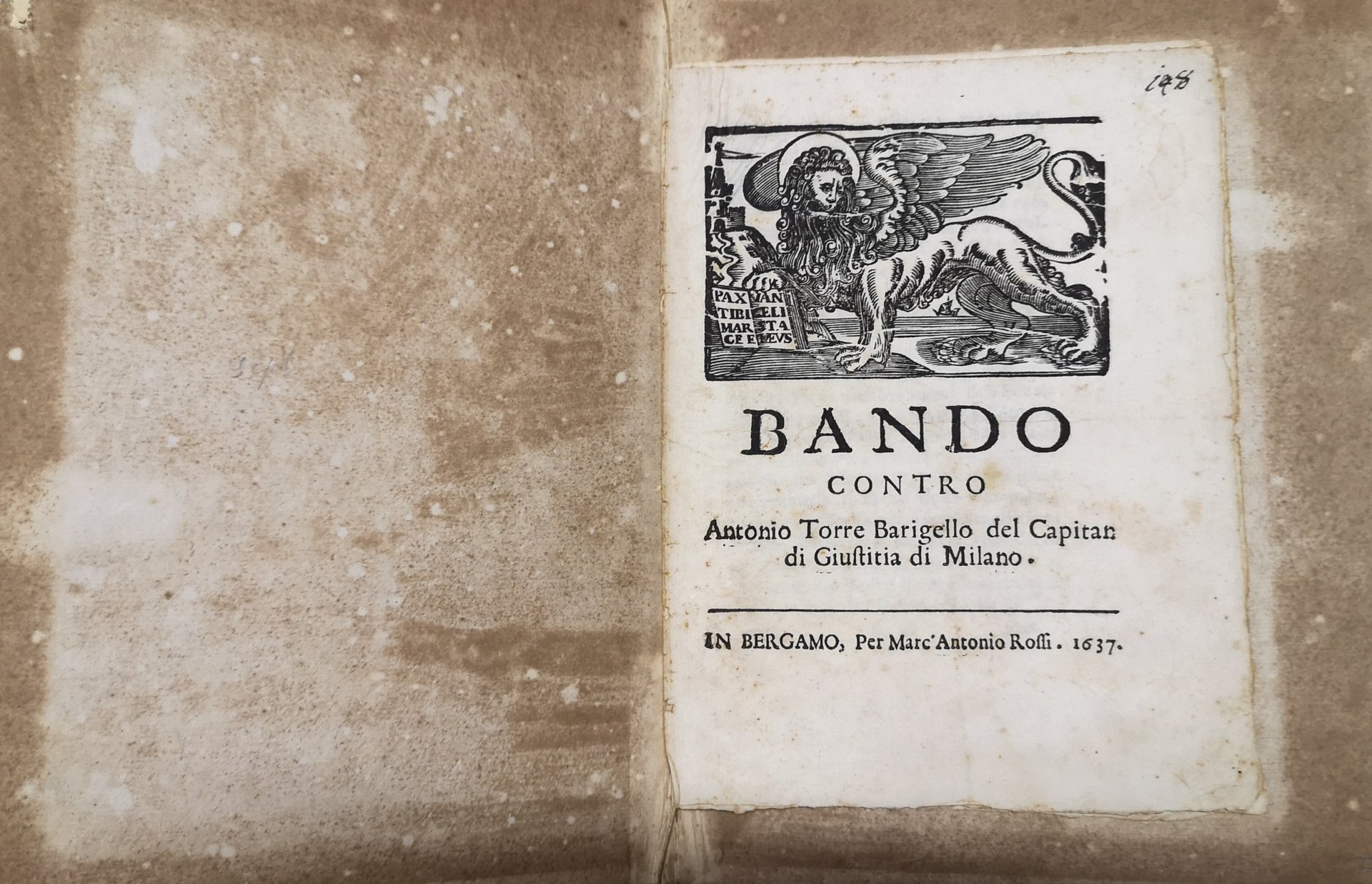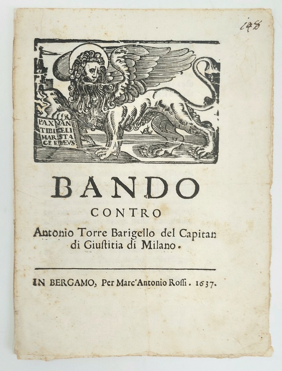 >opuscolo in-4, ff. 4 n.n., l'ultimo bianco, sciolto. Al frontespizio grande e bella figura silografica del Leone di San Marco. Un capolettera ornato. Bando di cattura per l'assassinio di Gio. Giacomo Preta detto Quaino in Torlino (Crema, oggi Torlino Vimercate), ucciso da Antonio Torre, ufficiale del Capitano di Giustitia di Milano. Nel bando viene descritta l'esatta dinamica del delitto. Raro.
