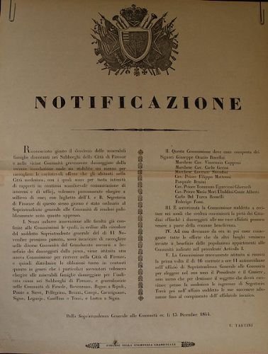 (Bando originale per regolare gli aiuti in seguito all'alluvione del 3 novembre 1844).