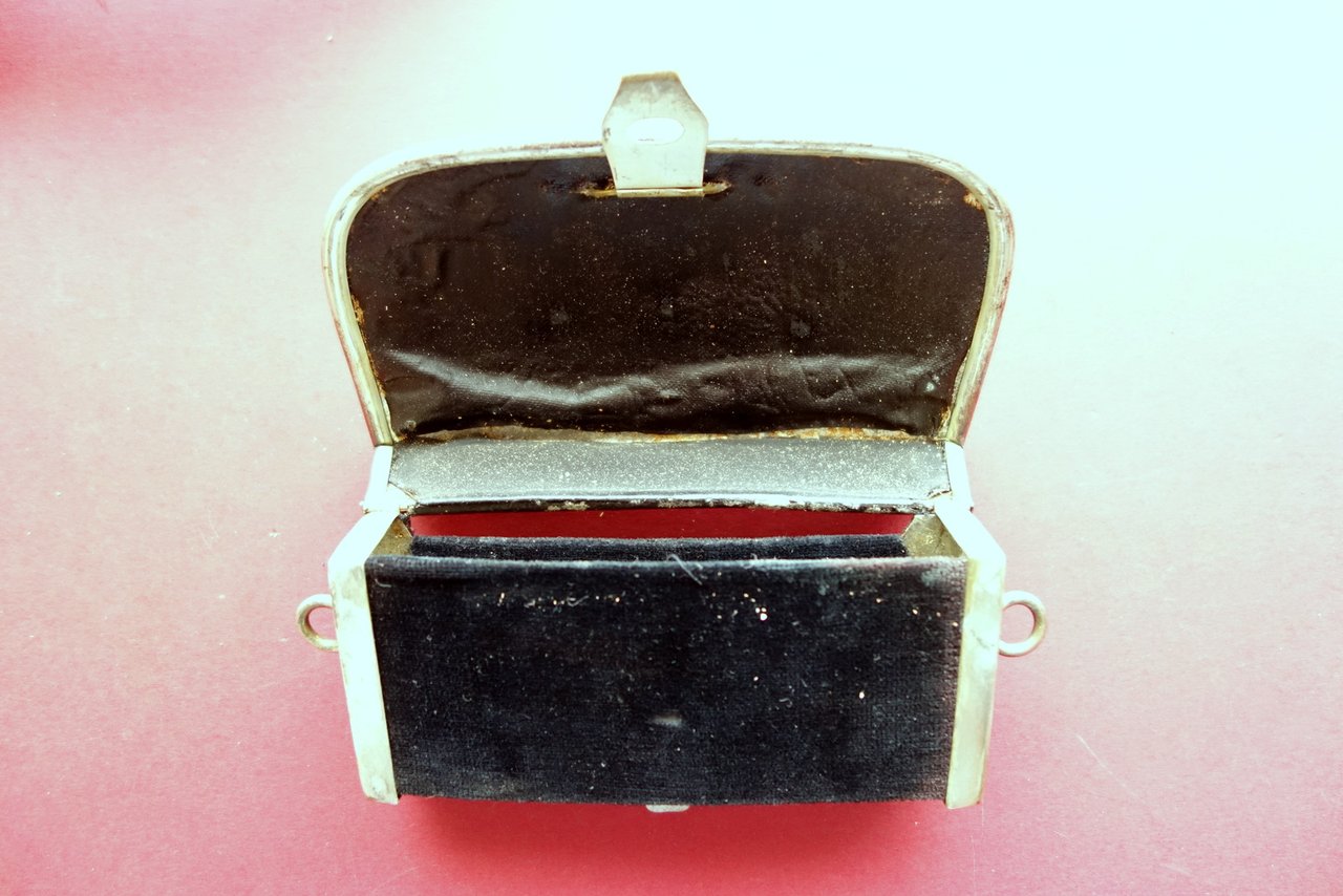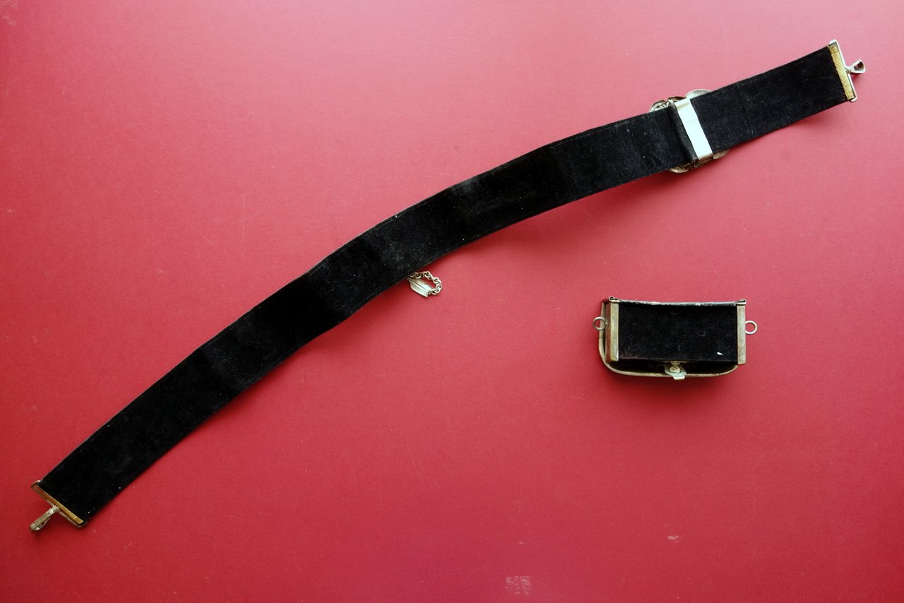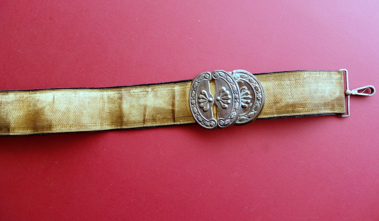 Bandoliera originale, Bandoliera originale con giberna completa con fregi metallici regio esercito italiano primo Novecento circa S. d. (primo Novecento) bandoliera originale completa, corredata di giberna; fregi metallici in rilievo; tessuto dorato cucito su velluto. Condizioni di conservazione Esemplare complessivamente ben conservato con tracce d'uso e del tempo, non lucidata, con una catenella metallica da saldare (vedi foto); alcune leggere tracce di sporco; sezioni metalliche in pi√π punti leggermente ossidate. Giberna con leggere abrasioni. SC04.D0318 N
