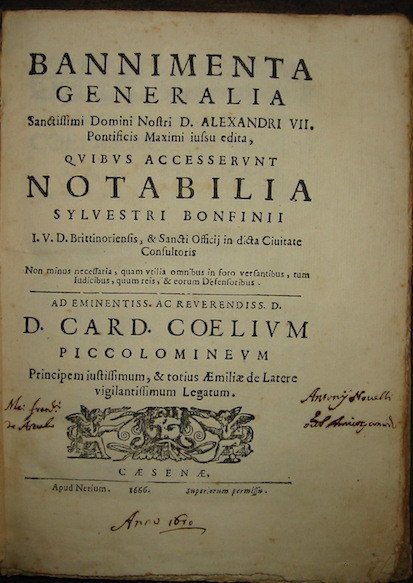 Bannimenta generalia. Alexandri VII. Pontificis Maximi iussu edita, quibus accesserunt Notabilia Sylvestri Bonfinii. non minus necessaria, quam utilia omnibus in foro versantibus, tum iudicibus, quum reis, & eorum defensoribus.