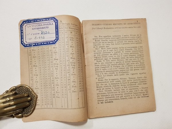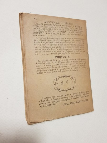 Cm. 15,5 x 11; pp. 64 con piccole vignette xilografiche; brossura editoriale (autocopertinato); cucito.<BR>CONDIZIONI ACCETTABILI (strappo di cm. 1,5 alla parte alta del dorso; consueta ingiallitura delle pagine dovute alla qualità della carta; etichetta di vecchia libreria al contropiatto); manca la copertina.<BR>Numero raro.<BR><BR>Gli astri , il Sole ed ogni sfera / Or misura il Barba-Nera / per potere altrui predire / tutto quel che ha da venire.