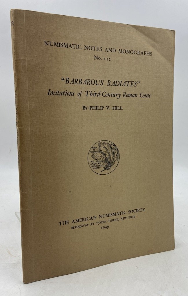 Brossura editoriale a stampa, cm 23 x 15.5, pp 44 (4) + 4 tavole. Numismatic Notes and Monographs No. 112. Monografia sui radiati barbari, con particolare riferimento ai ripostigli e siti archeologici britannici.