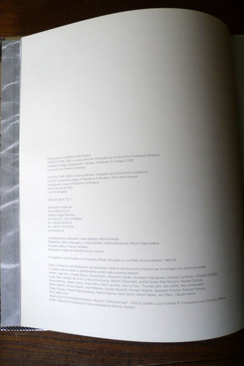 VENEZIA 1948-1986LA SCENA DELL'ARTE.Fotografie da ArchivioArte Fondazione Modena,Collezione Peggy Guggenheim,Venezia 5 febbraio-21 maggio 2006,a cura di Luca Massimo Barbero,catalogo della mostra,Fondazione Cassa di Risparmio di Modena /Skira Editore, 2006,copertina rigida, 30x24,5 cm., pp.322,illustrazioni fotografiche in bianco e nero,ISBN: 88-7624-721-1,peso: kg.2,4