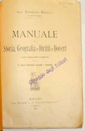 Ernesto Barilli, Ulrico Martinelli, Manuale di storia, geografia e diritti e doveri secondo i programmi ufficiali 29 gennaio 1905 per le 3e classi elementari maschili e femminili, Casa Editrice L. F. Pallestrini e C., Milano 1905, pp. 67, ill. b.n., cm 21, br. ed. Alla copertina, timbro: Approvato dalle Commissioni Provinciali per l'esame dei Libri di Testo. Al frontespizio, timbro: Omaggio degli Editori. Firma d'appartenenza e sigla alla copertina, tracce d'uso, piccole mancanze al dorso, ma nel complesso buono.