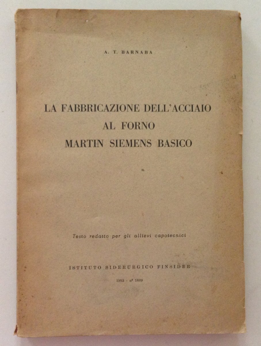 A. T. Barnaba, La fabbricazione dell'acciaio al forno Martin Siemens Basico Istituto Siderurgico Finsider 1953, cm 24.5x17, pp. 289+76 figg. f.t., ill. b/n n.t e f.t., solo uso interno, ed. numerata n/s 1609, cart.ed. Condizioni di conservazione Esemplare in buone condizioni con tracce d'uso e qualche brunitura; cartoncino editoriale con alcuni strappetti e pieghette ai margini, agli angoli e al dorso; cuffia inferiore del dorso con una minima mancanza. SETT105.L10108 MT