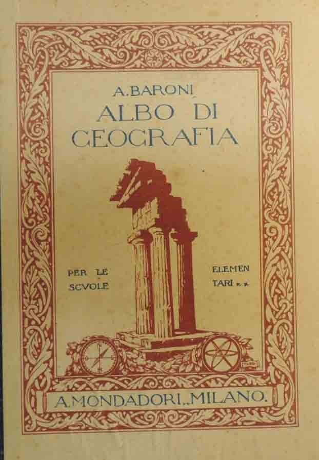 Augusto Baroni, Albo di geografia per le scuole elementari. Classe V, edizioni A. Mondadori, Milano 1925, pp. 169, ill. b.n., 5 c. di tavv. ill. coll. con carte geografiche, cm 25, mezza tela ed. con titoli e decorazioni ai piatti. Leggere tracce d’uso, primo fascicolo un po’ allentato, per il resto buono. Raro.