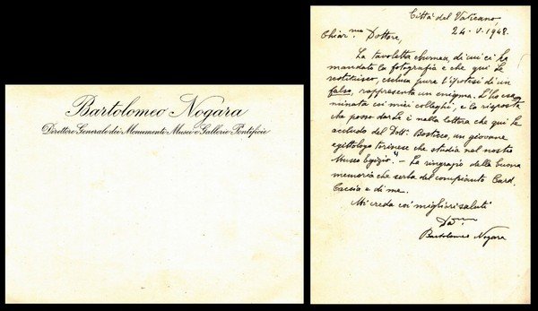 biglietto manoscritto e firmato di Bartolomeo Nogara di 1 facciata datato CIttà Del Vaticano, 24 Maggio 1948 su carta intestata personale "Direttore Generale dei Monumenti Musei e Gallerie Pontificie"; ottimo es.