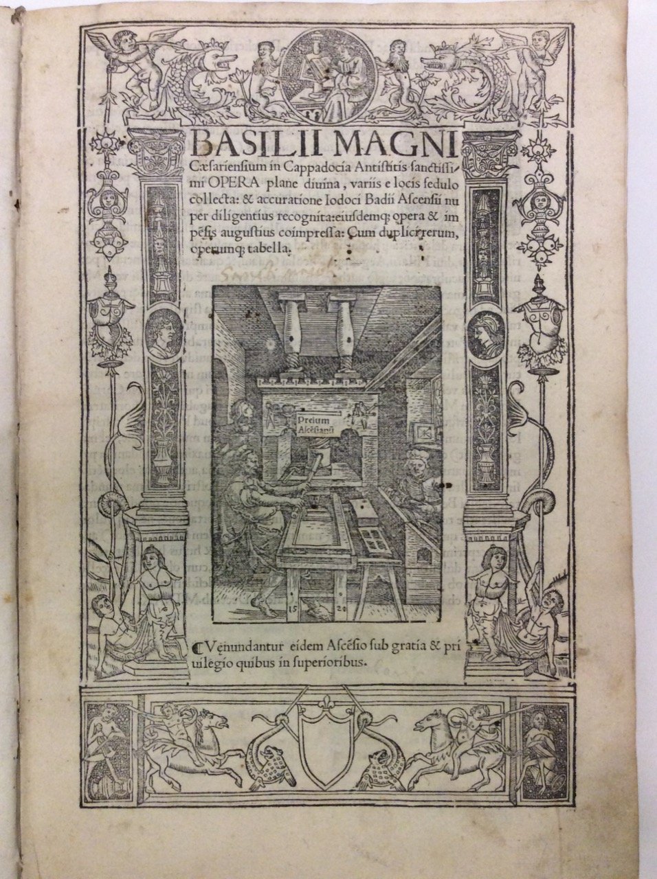 In-4 (mm. 316x210), p. pergamena coeva, dorso a cordoni (con mancanze) e titolo ms., cc.nn. 8, cc.num. CLXXIII, c.b. 1; ornato da bellissime grandi iniziali a vignetta inc. su legno; al verso dell'ultima carta: impressa autem sunt rursus, opera, industria & recognitione Iodoci Badii Ascensii, ad Idus Maias, Anni dominici MDXXIII; al frontespizio, entro pregevole cornice architettonica riccamente figurata, è riportata la marca tipografica di Josse Badius (Jodocus Badius o Josse Bade): bottega di tipografo con tre persone al lavoro e una scritta al centro Prelum Ascensianum o Pressa di Asse poichè Badius provenina dal villaggio fiammingo dl Asse, con la data 1520 nella parte inferiore del torchio.Ristampa dell'ediz. 1520, di questa importante raccolta delle opere.Cfr. Graesse,I,306.Basilio di Cesarea detto il Grande (in latino Basilius Magnus), dottore della Chiesa (Cesarea di Cappadocia 339 ca. - ivi 379). Figlio dei santi Basilio ed Emmelia, fratello di Gregorio di Nissa e di Pietro di Sebaste, studiò in patria, a Costantinopoli e ad Atene, ove si legò con profonda amicizia a Gregorio Nazianzeno.. Dal vescovo Eusebio fu ordinato sacerdote.. fu eletto Vescovo, non senza contrasti, nel 370.. Tra gli scritti a noi pervenuti vanno segnalate le omelie sulla creazione, che trattano dei soli primi 5 giorni (esclusa cioè la creazione dell'uomo), quelle su 14 salmi e altre 24 di vario argomento.. opere ascetiche ("Moralia", risposte a vari quesiti, le Regole lunghe e brevi'). Vanno infine menzionati l'Epistolario (366 lettere, alcune di altri a Basilio, alcune spurie; la corrispondenza con Libanio, discussa), in cui rifulge meglio il valore di Basilio come scrittore.. Ma Basilio è soprattutto il legislatore della vita monastica... Così Diz. Treccani,II, p. 115.Fori di tarlo ai risg. con tratti di matita rossa (anche su 3 carte del t.); antiche postille e sottolineature a penna; con aloni margin. intercalati nel testo, ma complessivam. discreto esemplare.