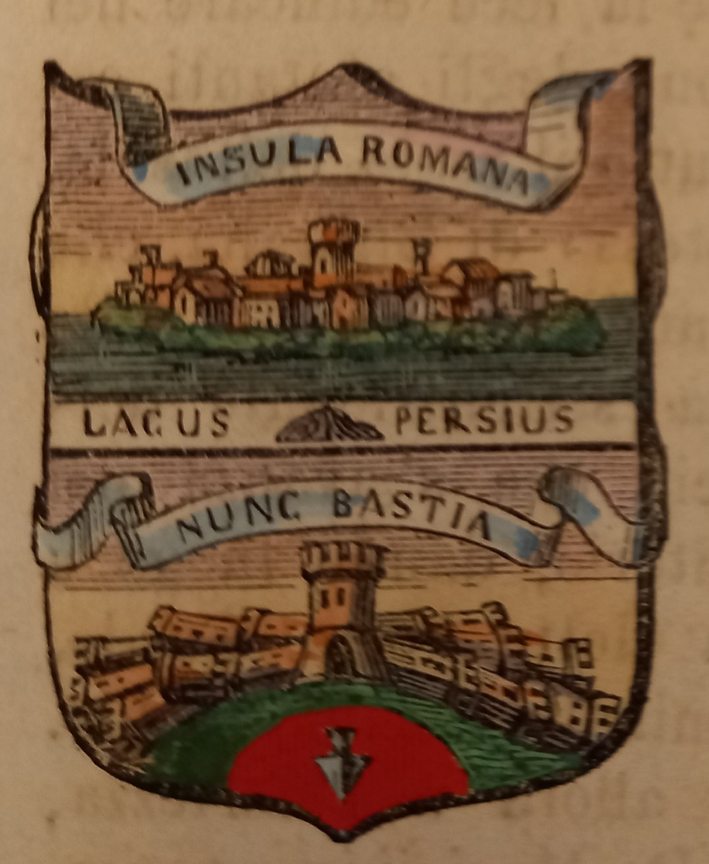Piccolo stemma comunale colorato a mano d’epoca (cm. 3,8 x 3,2 ca.). Stralcio dal Dizionario Corografico illustrato dell’Italia, edito a Milano nel 1868. Ogni stemma di questa raccolta è inserito in una o più pagine di testo con la descrizione della località, notizie storico - geografiche e statistiche (numero degli abitanti e degli elettori, guarnigioni della Guardia Nazionale, ecc.). Spesso il testo è redatto da studiosi locali o dai sindaci, con maggiori, interessanti notizie.