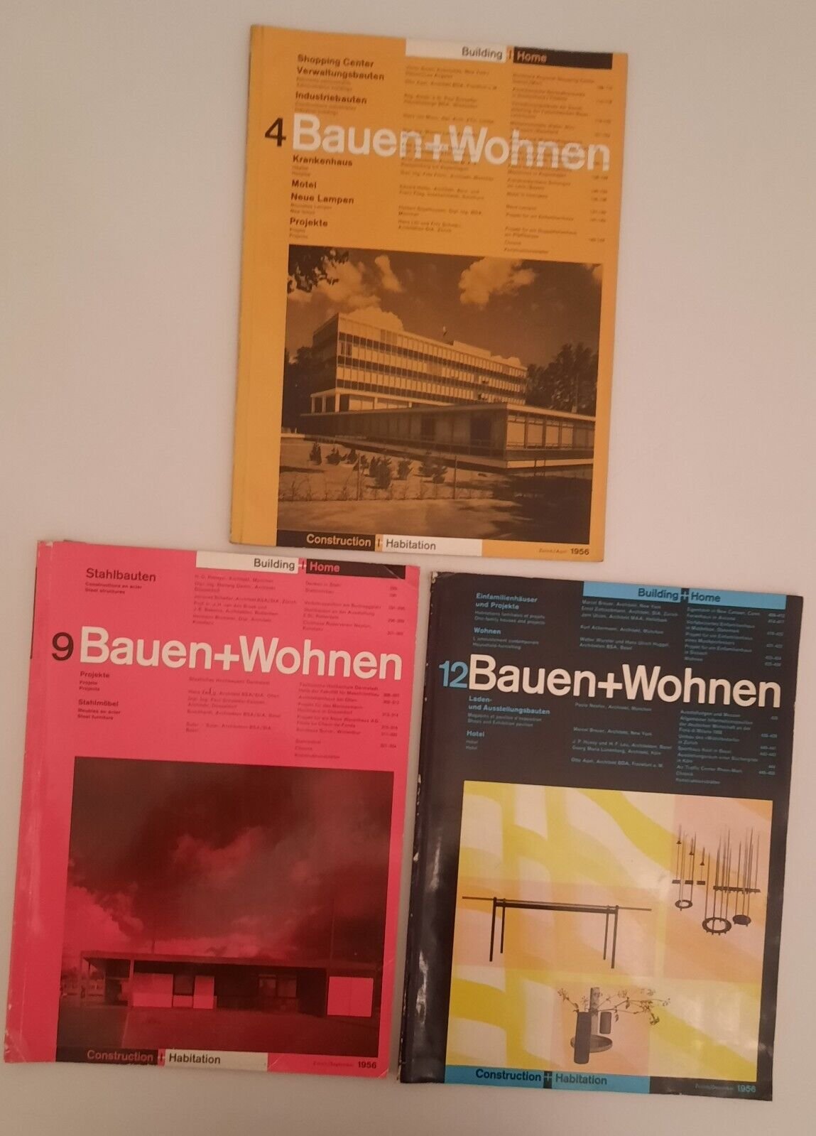 BAUEN + WOHNEN BUILDING HOME N. 4 - 9 - 12 1956In 4°, 3 volumi, legatura editoriale , copertina illustrata, ill. in b/n e pagine a colori.In ottime condizioni, lievi segni del tempo.Ulteriori dettagli e immagini a richiesta.
