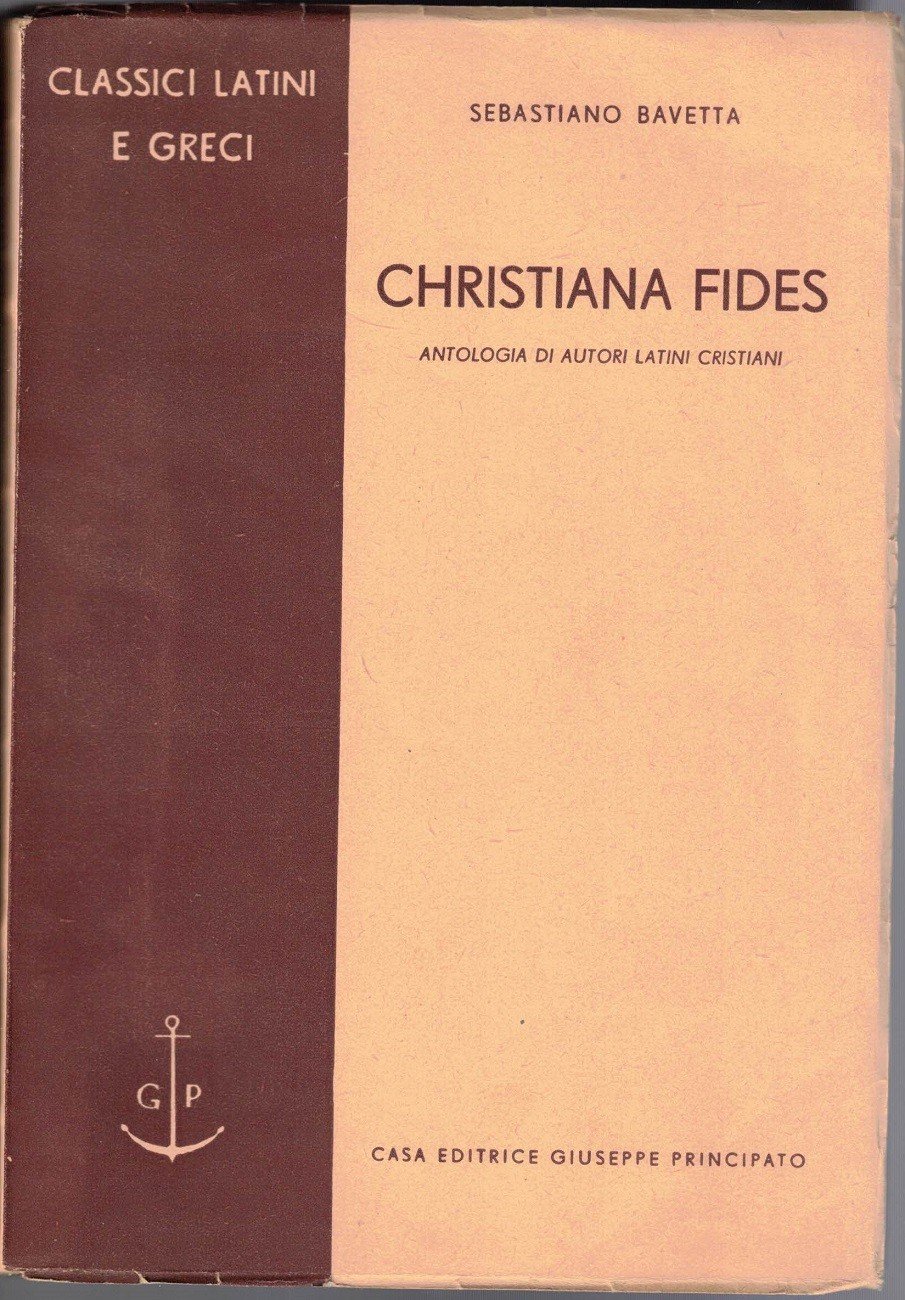 Sebastiano Bavetta, Christiana fides. Antologia di autori latini cristiani, Casa Editrice Giuseppe Principato, Milano 1949, pp. 346, cm 20, br. ed. Collana Classici latini e greci. Firma d’appartenenza a una delle carte interne. Lievi tracce d’uso, minime fioriture, tenue brunitura della carta, per il resto ben conservato.