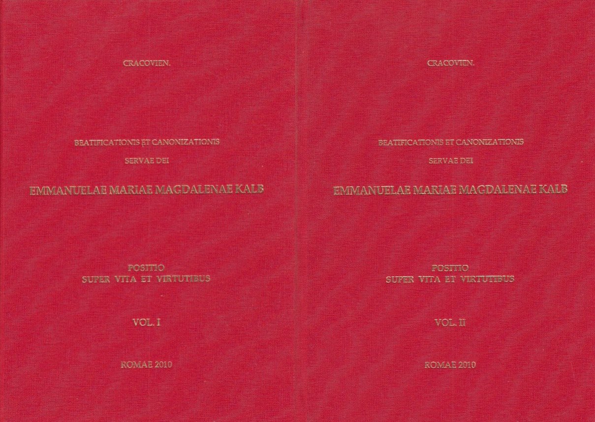 Beatificationis Canonizationis Servae Dei Emmanuelae Mariae Magdalenae Kalb Soris Professae e Congregationis Sororum Canonissarum Spiritus Sancti de Saxia (1899-1986) Positio Super vita et virtutibus. Congregatio De Causis Sanctorum, 20102 Voll. In-4 (Cm 29,5 x 20,5), pp. 742-589-XIX , legatura editoriale in piena tela rosso, fotografie a colori nelle ultime XIX pagine del secondo volume. Testi in Italiano e latino. Fotografia della venerabile all'antiporta COME NUOVO