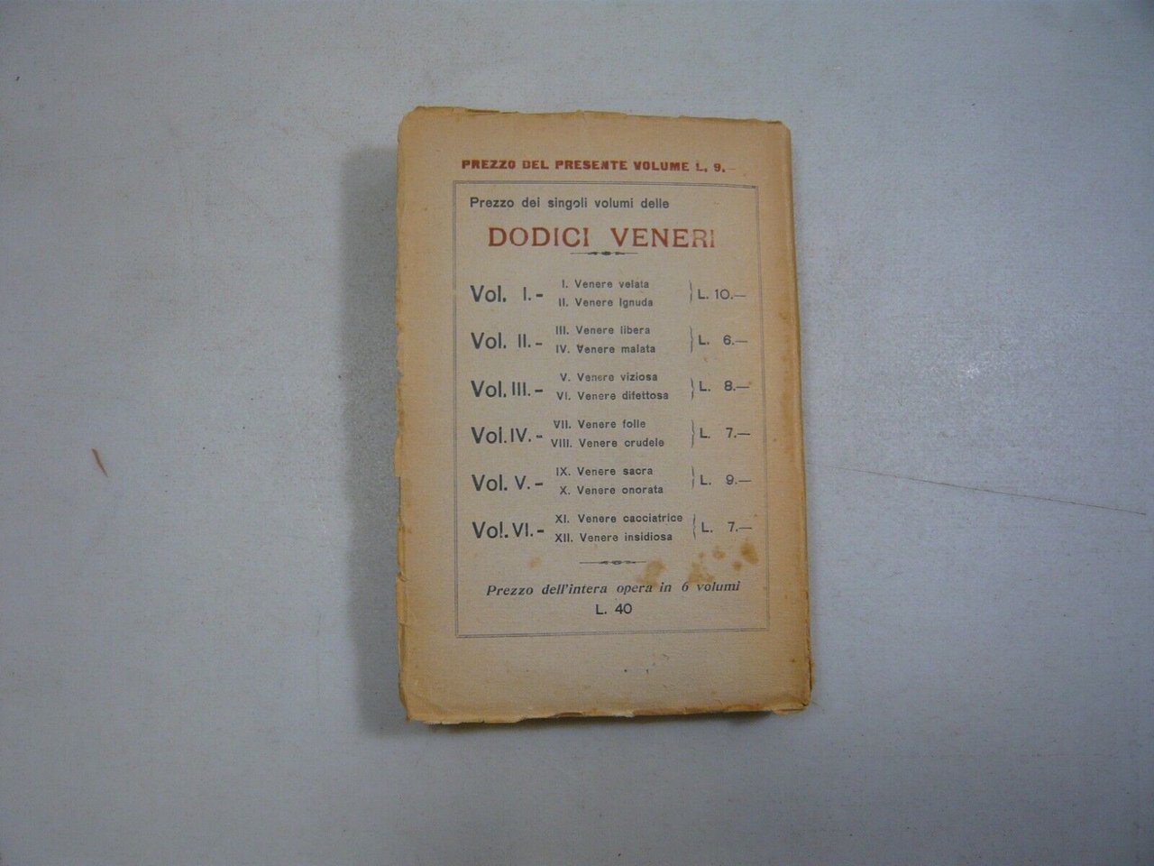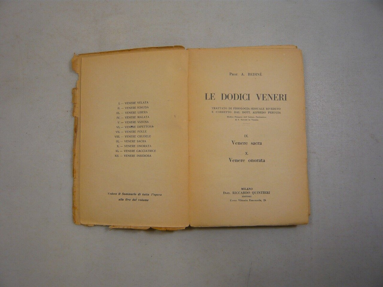 Prof. A. BedinéLE DODICI VENERI Vol. 5Trattato di fisiologia sessuale riveduto e corretto dal Dott. Alfredo PerugiaIX. VENERE SACRAX. VENERE ONORATAQuintieri editore, Milano, 1923Brossura, 19x13cm, pp.315Peso: 260g