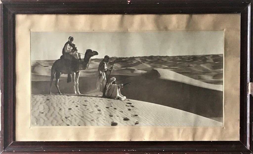 In oblungo; 57x28 cm la foto e 74x45 cm le cornici. I puntini bianchi sulla foto sono causati da polvere sul vetro, all'interno in buone-ottime condizioni di conservazione. Magnifica fotografia con passepartou, inserita in una cornice coeva. Rarissima come tutte le fotografie dei due celebri fotografi ma ancor più rare per le loro enormi dimensioni. Le dimensioni della fotografia richiamano alla serie di fotografie africane che Ernst Heinrich Landrock e Rudolf Franz Lehnert realizzarono intorno al 1905. Rudolf Franz Lehnert (Grossaupa, Boemia 13.07.1878 - Redeyef, Tunisia, 16 .01.1948) studiò presso l'Istituto d'Arti Grafiche di Vienna. Nel 1903 decide di fare un viaggio in Sicilia ma una volta giunto lì, prosegue per la Tunisia affezionandosi talmente tanto al luogo, da decidere di trasferirsi lì. Qui rimane quasi un anno per poi ritornare, nel 1904 in Svizzera dove conosce l'uomo d'affari Ernst Heinrich Landrock (Reinsdorf, Sachsen, 4.08.1878 - Kreuzlingen, Svizzera 30.04. 1966). I due diventano in breve tempo, grandi amici e lo spirito imprenditoriale di Landrock li porta a fondare una società a Tunisi al numero 7 di Rue de Tamis. Lehnert si si occupa della parte artistica mentre Landrock segue solo gli aspetti burocratici e pubblicitari dell'attività. Nel 1907 i due spostano la sede della loro società al numero 17 di Avenue de France. L'attività ha enorme successo tanto che i due aprono, un secondo atelier. Tutto sembra andare bene fino allo scoppio della Prima Guerra Mondiale quando per ragioni mai chiarite, probabilmente legate alla sua attività di fotografo, Lenhart viene accusato di spionaggio viene arrestato e il loro atelier sequestrati. Lenhart riesce a lasciare la Tunisia e a ritornare in Svizzera solo nel 1916. Qui incontra Landrock anche lui rifugiatosi in Svizzera. Nel 1922 sono di nuovo in Tunisia dove riescono a tornare in possesso della loro attività che però cedono per spostarsi in Egitto, al Cairo. Nel 1930 qualche cosa si rompe fra i due e la società viene disciolta. Lenhart, con la famiglia, si sposta in Tunisia. In realtà il nome della ditta Lehnert & Landrock rimane attivo al Cairo, gestita prima da Landrock e poi dal figlio della moglie. La produzione artistica di Landrock e Lehnert ebbe un enorme successo riuscendo a cogliere il gusto del pubblico occidentale attraverso vedute algerine, tunisine ed egiziane seppur non mancano anche serie fotografiche dedicate a Gerusalemme e diversi nudi di popolazioni indigene. Le foto tendono ad esaltare l'esoticità dei paesaggi africani. Magnifici i ritratti dei beduini nel deserto del Sahara. Rarissima ed in buone-ottime condizioni di conservazione (i piccoli puntini bianchi visibili sulla foto sono sul vetro della cornice). La foto qui presentata ritrae, proprio, un gruppo di tre indigeni, con cammello che guardano verso le dune sabbiose del Sahara. Rarità fotografica.